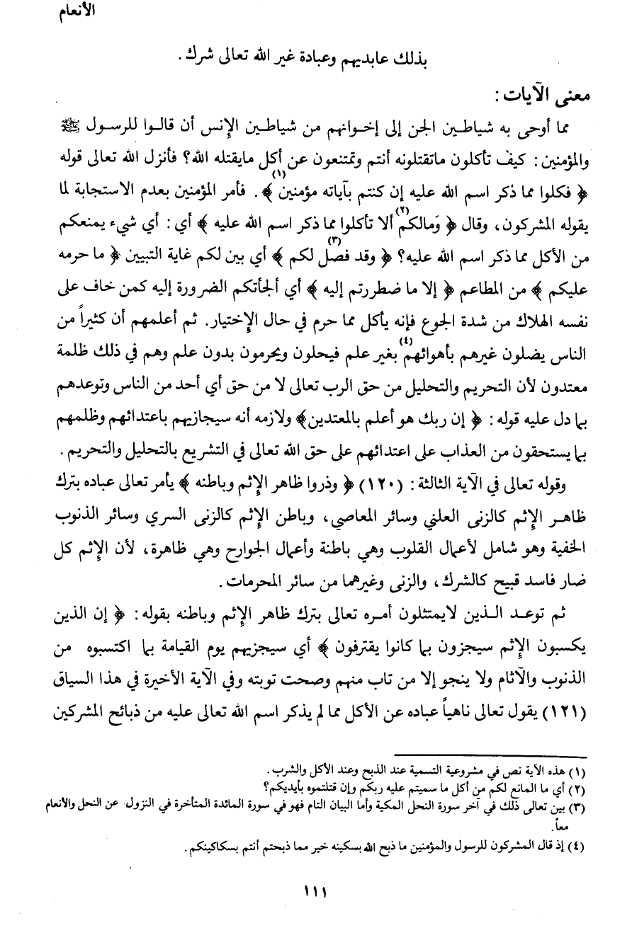 مما أوحى به شياطين الجن إلى إخوانهم من شياطين الإنس أن قالوا للرسول صَلَّى اللهُ عَلَيْهِ وَسَلَّمَ والمؤمنين: كيف تأكلون ما تقتلونه أنتم وتمتنعون عن أكل ما يقتله الله؟ فأنزل الله تعالى قوله {فكلوا مما ذكر اسم الله عليه إن كنتم بآياته مؤمنين1} . فأمر المؤمنين بعدم الاستجابة لما يقوله المشركون، وقال {وما لكم2 ألا تأكلوا مما ذكر اسم الله عليه} أي: أي شيء يمنعكم من الأكل مما ذكر اسم الله عليه؟ {وقد فصل3 لكم} أي بين لكم غاية التبيين {ما حرم عليكم} من المطاعم {إلا ما اضطررتم إليه} أي ألجأتكم الضرورة إليه كمن خاف على نفسه الهلاك من شدة الجوع فإنه يأكل مما حرم في حال الإختيار. ثم أعلمهم أن كثيراً من الناس يضلون غيرهم بأهوائهم4 بغير علم فيحلون ويحرمون بدون علم وهم في ذلك ظلمة معتدون لأن التحريم والتحليل من حق الرب تعالى لا من حق أي أحد من الناس وتوعدهم بما دل عليه قوله: {إن ربك هو أعلم بالمعتدين} ولازمه أنه سيجازيهم باعتدائهم وظلمهم بما يستحقون من العذاب على اعتدائهم على حق الله تعالى في التشريع بالتحليل والتحريم. وقوله تعالى في الآية الثالثة: (120) {وذروا ظاهر الإثم وباطنه} يأمر تعالى عباده بترك ظاهر الإثم كالزنى العلني وسائر المعاصي، وباطن الإثم كالزنى السري وسائر الذنوب الخفية وهو شامل لأعمال القلوب وهي باطنة وأعمال الجوارح وهي ظاهرة، لأن الإثم كل ضار فاسد قبيح كالشرك، والزنى وغيرهما من سائر المحرمات.