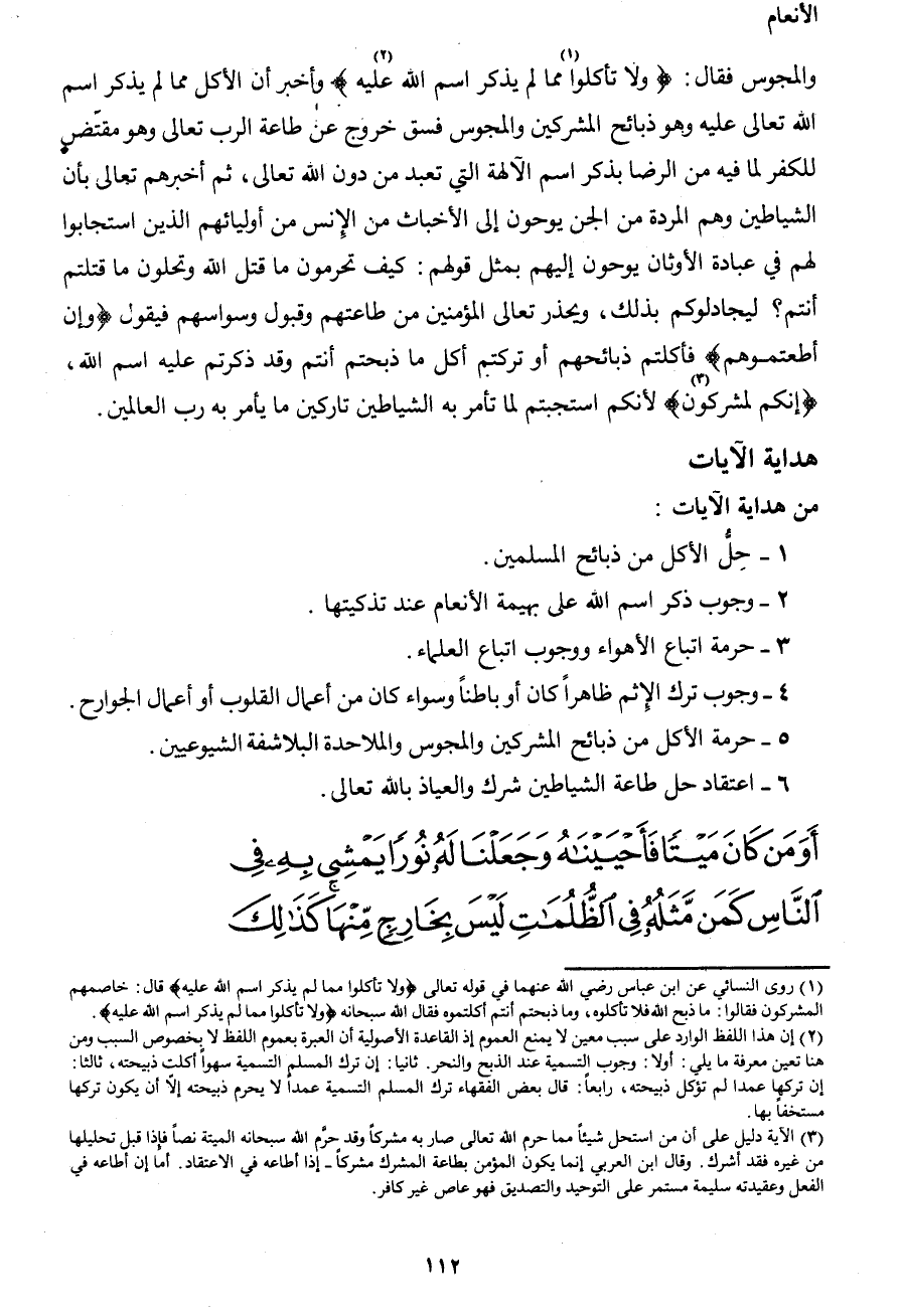 والمجوس فقال: {ولا تأكلوا1 مما لم يذكر اسم الله عليه2} وأخبر أن الأكل مما لم يذكر اسم الله تعالى عليه وهو ذبائح المشركين والمجوس فسق خروج عن طاعة الرب تعالى وهو مقتضي للكفر لما فيه من الرضا بذكر اسم الآلهة التي تعبد من دون الله تعالى، ثم أخبرهم تعالى بأن الشياطين وهم المردة من الجن يوحون إلى الأخباث من الإنس من أوليائهم الذين استجابوا لهم في عبادة الأوثان يوحون إليهم بمثل قولهم: كيف تحرمون ما قتل الله وتحلون ما قتلتم أنتم؟ ليجادلوكم بذلك، ويحذر تعالى المؤمنين من طاعتهم وقبول وسواسهم فيقول {وإن أطعتموهم} فأكلتم ذبائحهم أو تركتم أكل ما ذبحتم أنتم وقد ذكرتم عليه اسم الله، {إنكم لمشركون3} لأنكم استجبتم لما تأمر به الشياطين تاركين ما يأمر به رب العالمين.