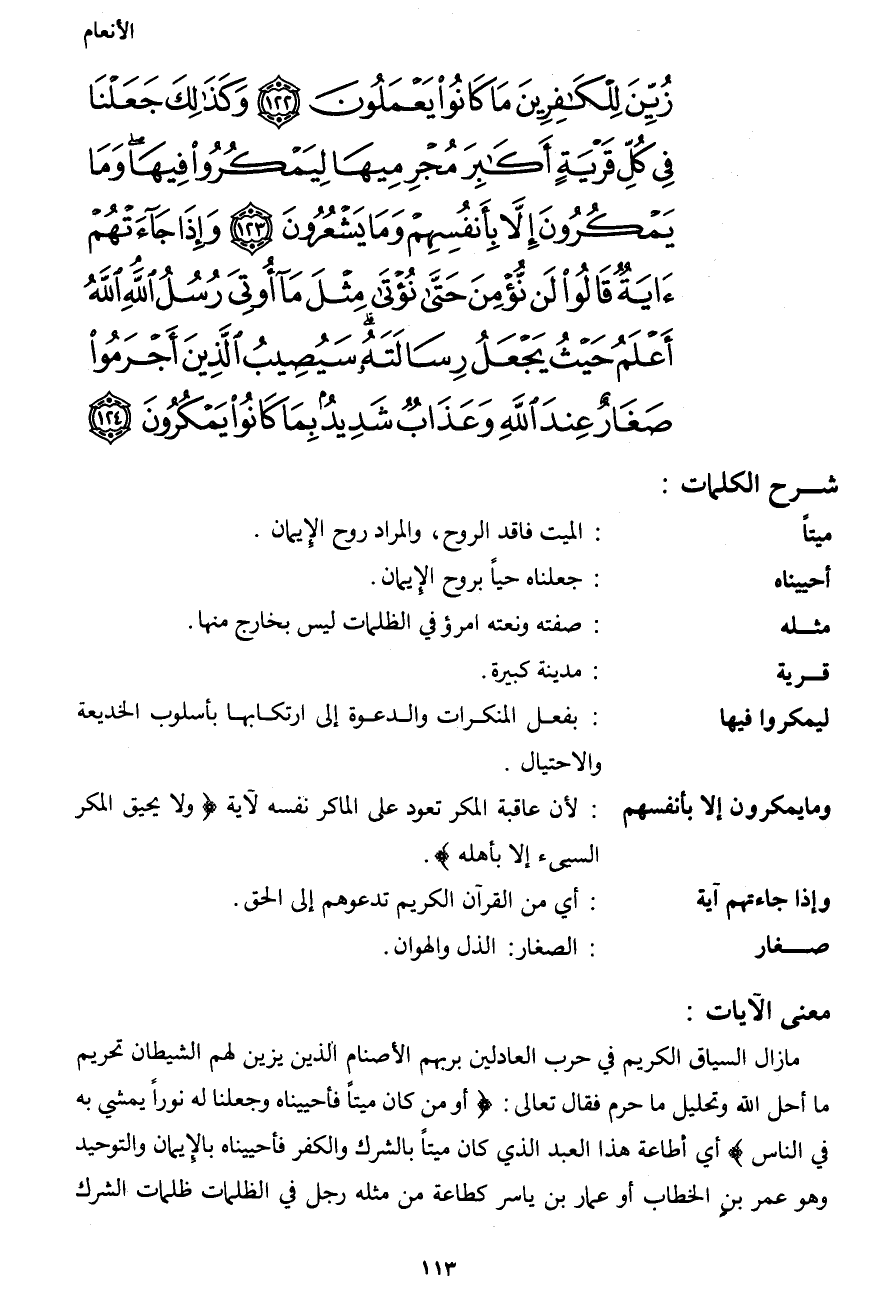زُيِّنَ لِلْكَافِرِينَ مَا كَانُواْ يَعْمَلُونَ (122) وَكَذَلِكَ جَعَلْنَا فِي كُلِّ قَرْيَةٍ أَكَابِرَ مُجَرِمِيهَا لِيَمْكُرُواْ فِيهَا وَمَا يَمْكُرُونَ إِلاَّ بِأَنفُسِهِمْ وَمَا يَشْعُرُونَ (123) وَإِذَا جَاءتْهُمْ آيَةٌ قَالُواْ لَن نُّؤْمِنَ حَتَّى نُؤْتَى مِثْلَ مَا أُوتِيَ رُسُلُ اللهِ اللهُ أَعْلَمُ حَيْثُ يَجْعَلُ رِسَالَتَهُ سَيُصِيبُ الَّذِينَ أَجْرَمُواْ صَغَارٌ عِندَ اللهِ وَعَذَابٌ شَدِيدٌ بِمَا كَانُواْ يَمْكُرُونَ (124)