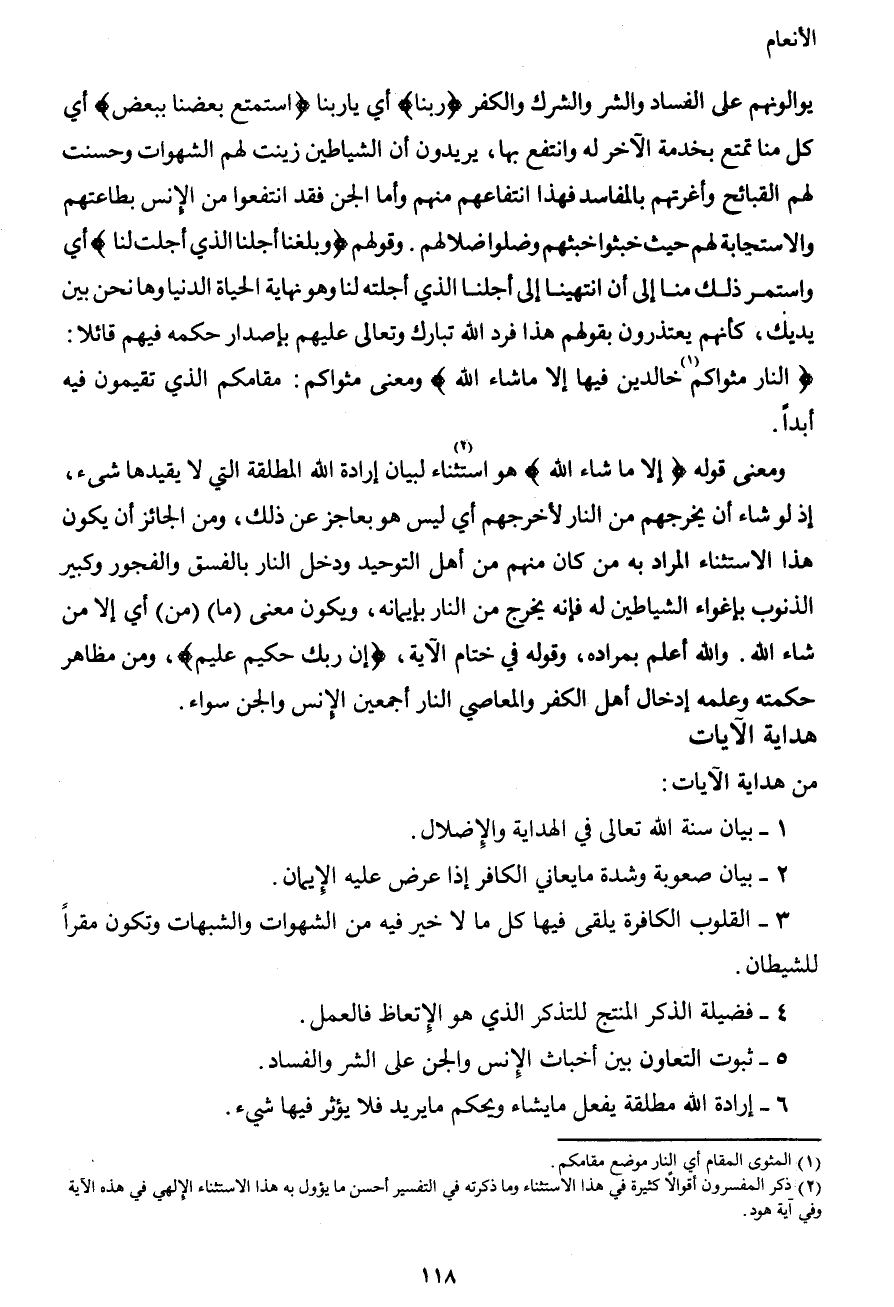 ومعنى قوله {إلا ما شاء الله} هو استثناء2 لبيان إرادة الله المطلقة التي لا يقيدها شيء، إذ لو شاء أن يخرجهم من النار لأخرجهم أي ليس هو بعاجز عن ذلك، ومن الجائز أن يكون هذا الاستثناء المراد به من كان منهم من أهل التوحيد ودخل النار بالفسق والفجور وكبير الذنوب بإغواء الشياطين له فإنه يخرج من النار بإيمانه، ويكون معنى (ما) (من) أي إلا من شاء الله. والله أعلم بمراده، وقوله في ختام الآية، {إن ربك حكيم عليم} ، ومن مظاهر حكمنه وعلمه إدخال أهل الكفر والمعاصي النار أجمعين الإنس والجن سواء.