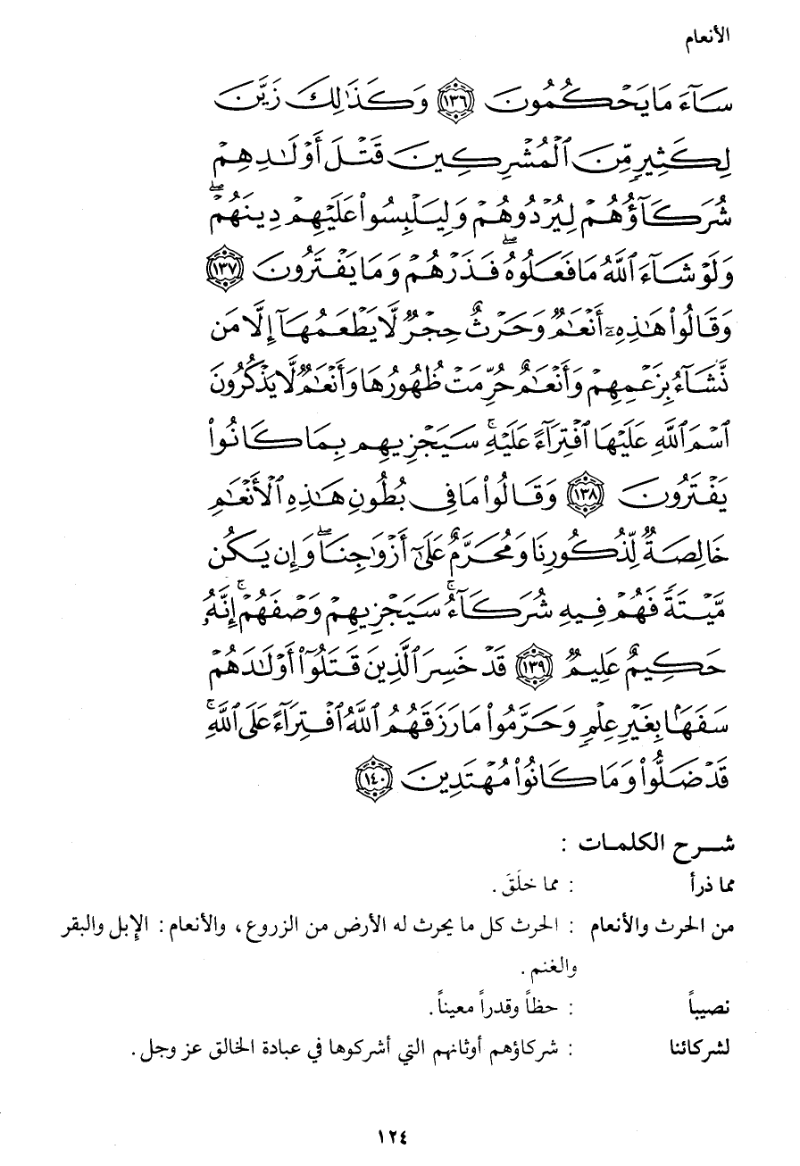 سَاء مَا يَحْكُمُونَ (136) وَكَذَلِكَ زَيَّنَ لِكَثِيرٍ مِّنَ الْمُشْرِكِينَ قَتْلَ أَوْلاَدِهِمْ شُرَكَآؤُهُمْ لِيُرْدُوهُمْ وَلِيَلْبِسُواْ عَلَيْهِمْ دِينَهُمْ وَلَوْ شَاء اللهُ مَا فَعَلُوهُ فَذَرْهُمْ وَمَا يَفْتَرُونَ (137) وَقَالُواْ هَذِهِ أَنْعَامٌ وَحَرْثٌ حِجْرٌ لاَّ يَطْعَمُهَا إِلاَّ مَن نّشَاء بِزَعْمِهِمْ وَأَنْعَامٌ حُرِّمَتْ ظُهُورُهَا وَأَنْعَامٌ لاَّ يَذْكُرُونَ اسْمَ اللهِ عَلَيْهَا افْتِرَاء عَلَيْهِ سَيَجْزِيهِم بِمَا كَانُواْ يَفْتَرُونَ (138) وَقَالُواْ مَا فِي بُطُونِ هَذِهِ الأَنْعَامِ خَالِصَةٌ لِّذُكُورِنَا وَمُحَرَّمٌ عَلَى أَزْوَاجِنَا وَإِن يَكُن مَّيْتَةً فَهُمْ فِيهِ شُرَكَاء سَيَجْزِيهِمْ وَصْفَهُمْ إِنَّهُ حِكِيمٌ عَلِيمٌ (139) قَدْ خَسِرَ الَّذِينَ قَتَلُواْ أَوْلاَدَهُمْ سَفَهًا بِغَيْرِ عِلْمٍ وَحَرَّمُواْ مَا رَزَقَهُمُ اللهُ افْتِرَاء عَلَى اللهِ قَدْ ضَلُّواْ وَمَا كَانُواْ مُهْتَدِينَ (140)