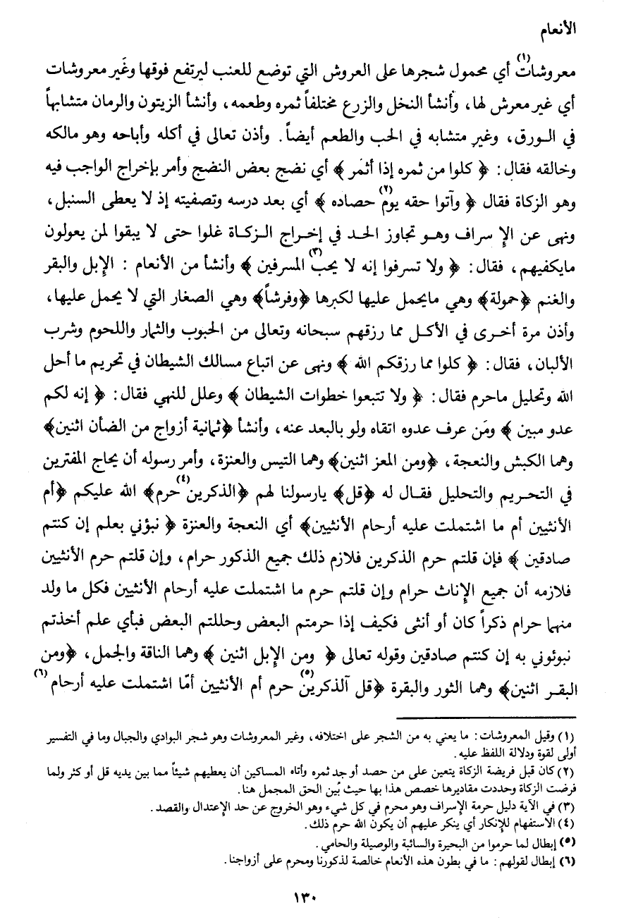 معروشات1 أي محمول شجرها على العروش التي توضع للعنب ليرتفع فوقها وغير معروشات أي غير معرش لها، وأنشأ النخل والزرع مختلفاً ثمره وطعمه، وأنشأ الزيتون والرمان متشابهاً في الورق، وغير متشابه في الحب والطعم أيضاً. وأذن تعالى في أكله وأباحه وهو مالكه وخالقه فقال: {كلوا من ثمره إذا أثمر} أي نضج بعض النضج وأمر بإخراج الواجب فيه وهو الزكاة فقال {وآتوا حقه يوم2 حصاده} أي بعد درسه وتصفيته إذ لا يعطى السنبل، ونهى عن الإسراف وهو تجاوز الحد في إخراج الزكاة غلوا حتى لا يبقوا لمن يعولون ما يكفيهم، فقال: {ولا تسرفوا إنه لا يحب3 المسرفين} وأنشأ من الأنعام: الإبل والبقر والغنم {حمولة} وهي ما يحمل عليها لكبرها {وفرشاً} وهي الصغار التي لا يحمل عليهما، وأذن مرة أخرى في الأكل مما رزقهم سبحانه وتعالى من الحبوب والثمار واللحوم وشرب الألبان، فقال: {كلوا مما رزقكم الله} ونهى عن اتباع مسالك الشيطان في تحريم ما أحل الله وتحليل ما حرم فقال: {ولا تتبعوا خطوات الشيطان} وعلل للنهي فقال: {إنه لكم عدو مبين} ومن عرف عدوه اتقاه ولو بالبعد عنه، وأنشأ {ثمانية أزواج من الضأن اثنين} .