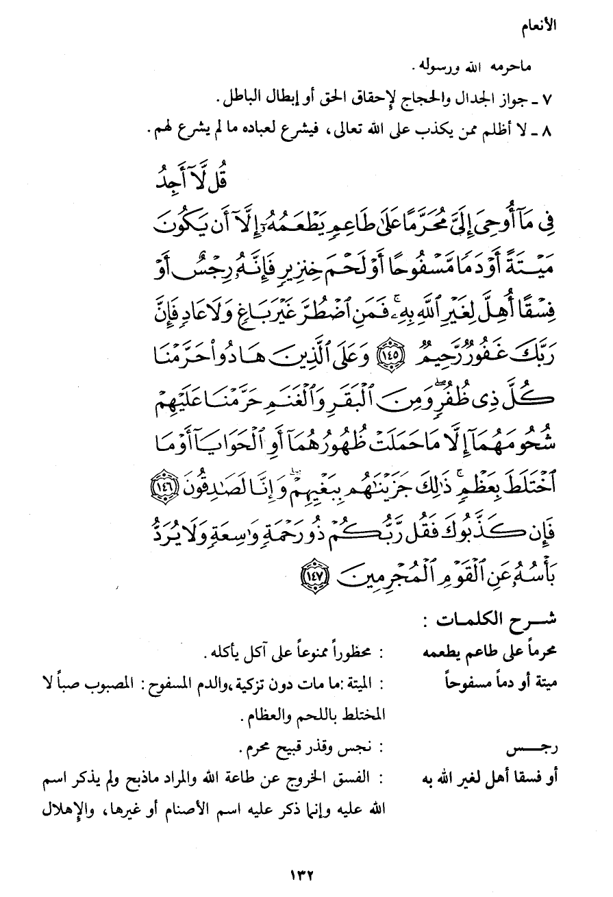 قُل لاَّ أَجِدُ فِي مَا أُوْحِيَ إِلَيَّ مُحَرَّمًا عَلَى طَاعِمٍ يَطْعَمُهُ إِلاَّ أَن يَكُونَ مَيْتَةً أَوْ دَمًا مَّسْفُوحًا أَوْ لَحْمَ خِنزِيرٍ فَإِنَّهُ رِجْسٌ أَوْ فِسْقًا أُهِلَّ لِغَيْرِ اللهِ بِهِ فَمَنِ اضْطُرَّ غَيْرَ بَاغٍ وَلاَ عَادٍ فَإِنَّ رَبَّكَ غَفُورٌ رَّحِيمٌ (145) وَعَلَى الَّذِينَ هَادُواْ حَرَّمْنَا كُلَّ ذِي ظُفُرٍ وَمِنَ الْبَقَرِ وَالْغَنَمِ حَرَّمْنَا عَلَيْهِمْ شُحُومَهُمَا إِلاَّ مَا حَمَلَتْ ظُهُورُهُمَا أَوِ الْحَوَايَا أَوْ مَا اخْتَلَطَ بِعَظْمٍ ذَلِكَ جَزَيْنَاهُم بِبَغْيِهِمْ وِإِنَّا لَصَادِقُونَ (146) فَإِن كَذَّبُوكَ فَقُل رَّبُّكُمْ ذُو رَحْمَةٍ وَاسِعَةٍ وَلاَ يُرَدُّ بَأْسُهُ عَنِ الْقَوْمِ الْمُجْرِمِينَ (147)