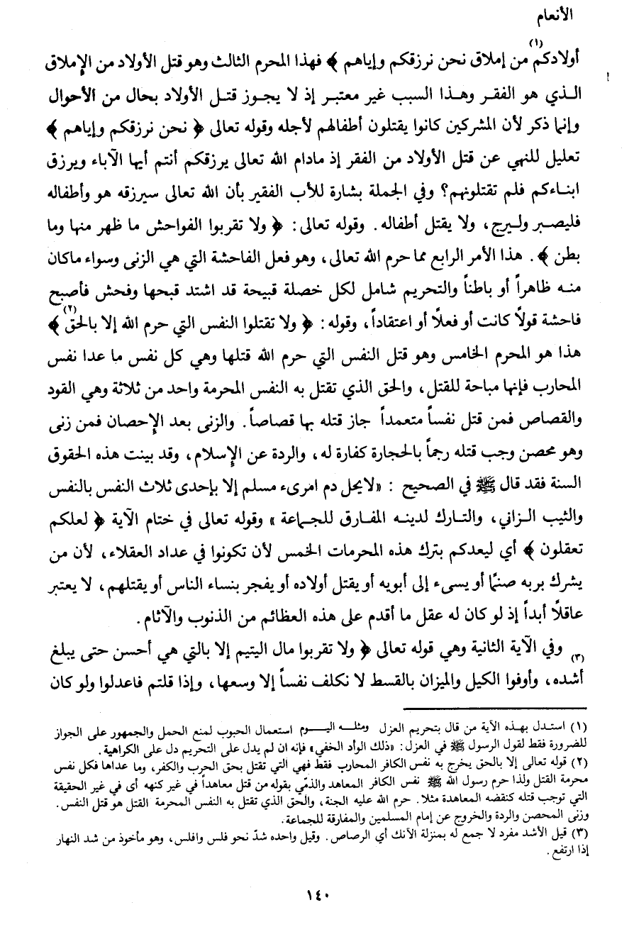 أولادكم1 من إملاق نحن نرزقكم وإياهم} فهذا المحرم الثالث وهو قتل الأولاد من الإملاق الذي هو الفقر وهذا السبب غير معتبر إذ لا يجوز قتل الأولاد بحال من الأحوال وإنما ذكر لأن المشركين كانوا يقتلون أطفالهم لأجله وقوله تعالى {نحن نرزقكم وإياهم} تعليل للنهي عن قتل الأولاد من الفقر إذ مادام الله تعالى يرزقكم أنتم أيها الآباء ويرزق ابناءكم فلم تقتلونهم؟ وفي الجملة بشارة للأب الفقر بأن الله تعالى سيرزقه هو وأطفاله فليصبر وليرج، ولا يقتل أطفاله. وقوله تعالى: {ولا تقربوا الفواحش ما ظهر منها وما بطن} . هذا الأمر الرابع مما حرم الله تعالى، وهو فعل الفاحشة التي هي الزنى وسواء ما كان منه ظاهراً أو باطناً والتحريم شامل لكل خصلة قبيحة قد اشتد قبحها وفحش فأصبح فاحشة قولاً كانت أو فعلاً أو اعتقاداً، وقوله: {ولا تقتلوا النفس التي حرم الله إلا بالحق2} هذا هو المحرم الخامس وهو قتل النفس التي حرم الله قتلها وهي كل نفس ما عدا نفس المحارب فإنها مباحة للقتل، والحق الذي تقتل به النفس المحرمة واحد من ثلاثة وهي القود والقصاص فمن قتل نفساً متعمداً جاز قتله بها قصاصاً. والزنى بعد الإحصان فمن زنى وهو محصن وجب قتله رجماً بالحجارة كفارة له، والردة عن الإسلام، وقد بينت هذه الحقوق السنة فقد قال صَلَّى اللهُ عَلَيْهِ وَسَلَّمَ في الصحيح: "لا يحل دم امرىء مسلم إلا بإحدى ثلاث النفس بالنفس والثيب الزاني، والتارك لدينه المفارق للجماعة" وقوله تعالى في ختام الآية {لعلكم تعقلون} أي ليعدكم بترك هذه المحرمات الخمس لأن تكونوا في عداد العقلاء، لأن من يشرك بربه صنماً أو يسيء إلى أبويه أو يقتل أولاده أو يفجر بنساء الناس أو يقتلهم، لا يعتبر عاقلاً أبداً إذ لو كان له عقل ما أقدم على هذه العظائم من الذنوب والآثام.