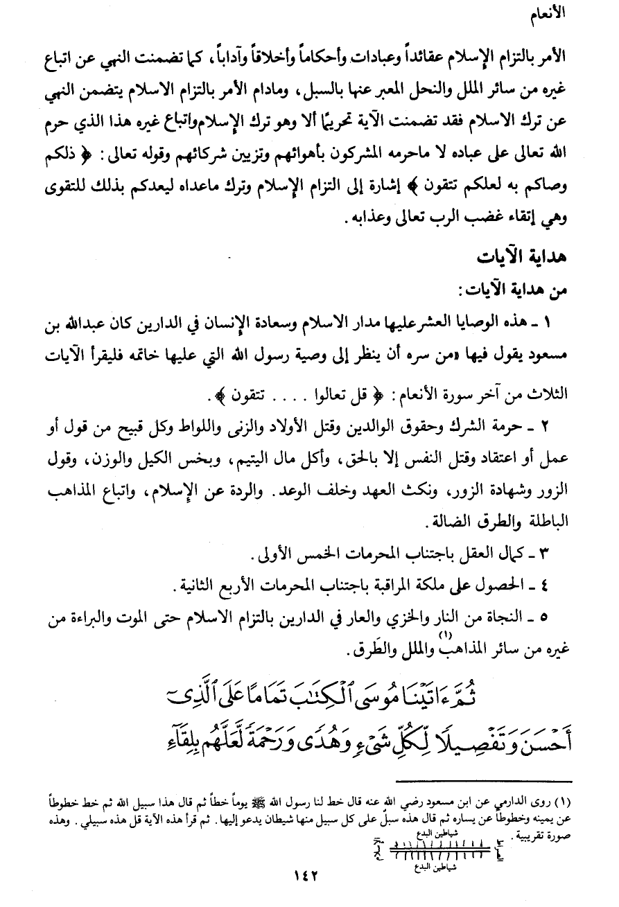 1 روى الدارمي عن ابن مسعود رضي الله عنه قال خط لنا رسول الله صَلَّى اللهُ عَلَيْهِ وَسَلَّمَ يوماً خطاً ثم قال هذا سبيل الله ثم خط خطوطاً عن يمينه وخطوطا عن يساره ثم قال هذه سبلٌ على كل سبيل منها شيطان يدعو إليها. ثم قرأ هذه الآية قل هذه سبيلي. وهذه صورة تقريبية.