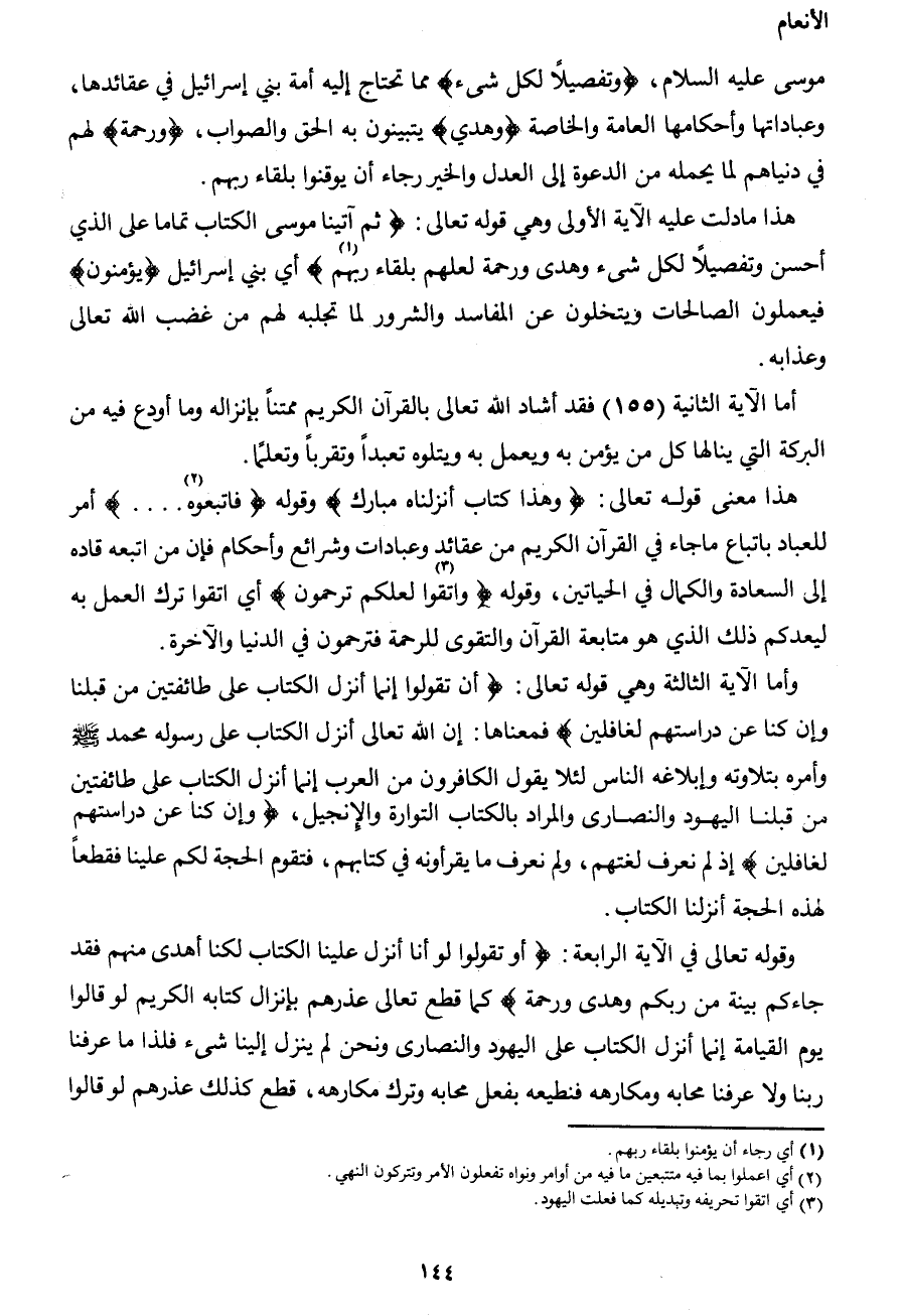 هذا ما دلت عليه الآية الأولى وهي قوله تعالى: {ثم آتينا موسى الكتاب تماماً على الذي أحسن وتفصيلاً لكل شيء وهدى ورحمة لعلهم بلقاء ربهم1} أي بني إسرائيل {يؤمنون} فيعملون الصالحات ويتخلون عن المفاسد والشرور لما تجلبه لهم من غضب الله تعالى وعذابه.
