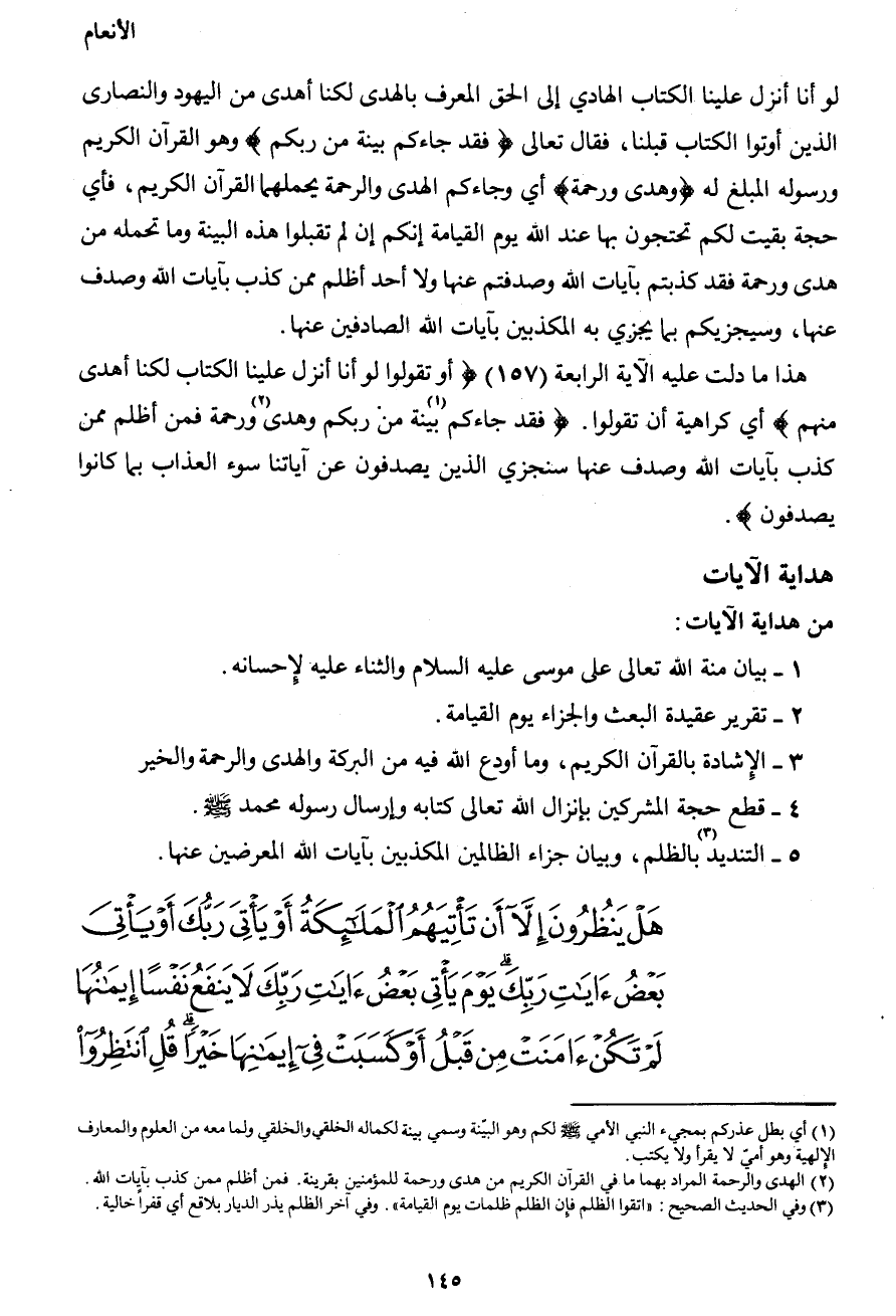 هذا ما دلت عليه الآية الرابعة (157) {أو تقولوا لو أنا أنزل علينا الكتاب لكنا أهدى منهم} أي كراهية أن تقولوا. (فقد جاءكم1 بينة من ربكم وهدى2 ورحمة فمن أظلم ممن كذب بآيات الله وصدف عنها سنجزي الذين يصدفون عن آياتنا سوء العذاب بما كانوا يصدفون} .