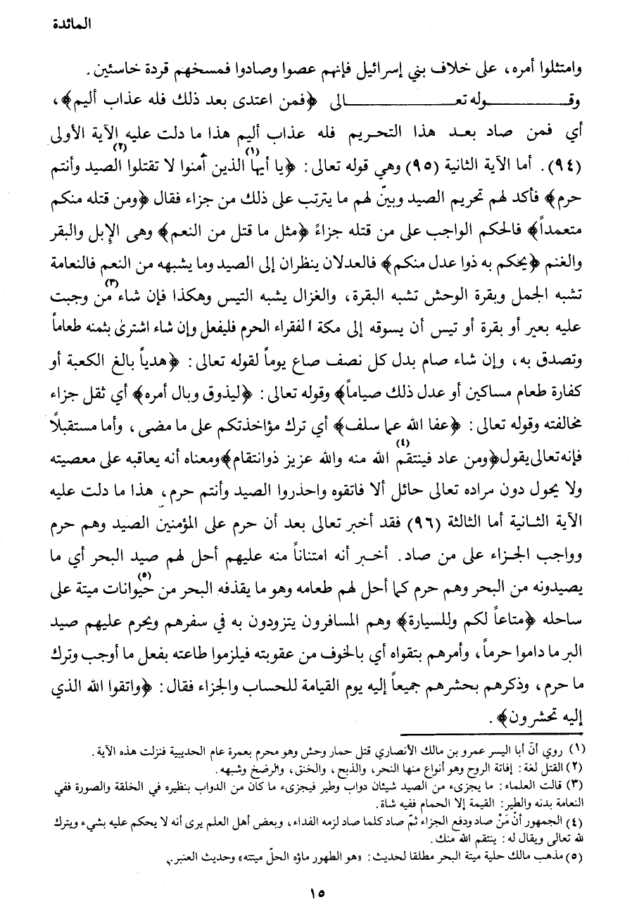 وامتثلوا أمره، على خلاف بني إسرائيل فإنهم عصوا وصادوا فمسخهم قردة خاسئين. وقوله تعالى {فمن اعتدى بعد ذلك فله عذاب أليم} ، أي فمن صاد بعد هذا التحريم فله عذاب أليم هذا ما دلت عليه الآية الأولى (94) . أما الآية الثانية (95) وهي قوله تعالى: {يا أيها1 الذين آمنوا لا تقتلوا2 الصيد وأنتم حرم} فأكد لهم تحريم الصيد وبين لهم ما يترتب على ذلك من جزاء فقال {ومن قتله منكم متعمداً} فالحكم الواجب على من قتله جزاءً {مثل ما قتل من النعم} وهى الإبل والبقر والغنم {يحكم به ذوا عدل منكم} فالعدلان ينظران إلى الصيد وما يشبهه من النعم فالنعامة تشبه الجمل وبقرة الوحش تشبه البقرة، والغزال يشبه التيس وهكذا فإن شاء3 من وجب عليه بعير أو بقرة أو تيس أن يسوقه إلى مكة الفقراء الحرم فليفعل وأن شاء اشترى بثمنه طعاماً وتصدق به، وإن شاء صام بدل كل نصف صاع يوماً لقوله تعالى: {هدياً بالغ الكعبة أو كفارة طعام مساكين أو عدل ذلك صياما} وقوله تعالى: {ليذوق وبال أمره} أي ثقل جزاء مخالفته وقوله تعالى: {عفا الله عما سلف} أي ترك مؤاخذتكم على ما مضى، وأما مستقبلاً فإنه تعالى يقول: {ومن عاد فينتقم4 الله منه والله عزيز ذو انتقام} ومعناه أنه يعاقبه على معصيته ولا يحول دون مراده تعالى حائل ألا فاتقوه واحذروا الصيد وأنتم حرم، هذا ما دلت عليه الآية الثانية أما الثالثة (96) فقد أخبر تعالى بعد أن حرم على المؤمنين الصيد وهم حرم وواجب الجزاء على من صاد. أخبر أنه امتناناً منه عليهم أحل لهم صيد البحر أي ما يصيدونه من البحر وهم حرم كما أحل لهم طعامه وهو ما يقذفه البحر من حيوانات5 ميتة على ساحله {متاعا لكم وللسيارة} وهم المسافرون يتزودون به في سفرهم ويحرم عليهم صيد البر ما داموا حرماً، وأمرهم بتقواه أي بالخوف من عقوبته فيلزموا طاعته بفعل ما أوجب وترك ما حرم، وذكرهم بحشرهم جميعاً إليه يوم القيامة للحساب والجزاء فقال: {واتقوا الله الذي إليه تحشرون} .