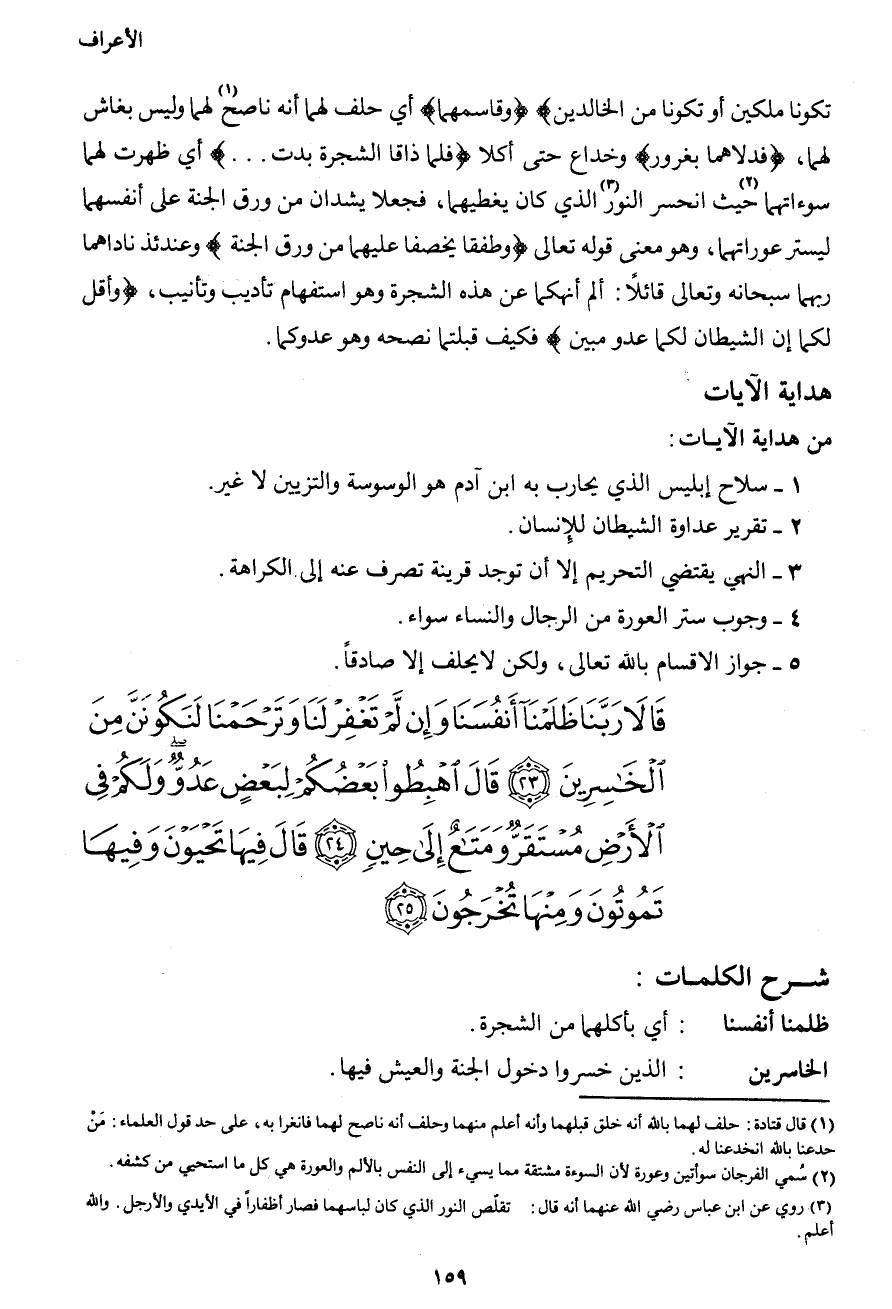 قَالاَ رَبَّنَا ظَلَمْنَا أَنفُسَنَا وَإِن لَّمْ تَغْفِرْ لَنَا وَتَرْحَمْنَا لَنَكُونَنَّ مِنَ الْخَاسِرِينَ (23) قَالَ اهْبِطُواْ بَعْضُكُمْ لِبَعْضٍ عَدُوٌّ وَلَكُمْ فِي الأَرْضِ مُسْتَقَرٌّ وَمَتَاعٌ إِلَى حِينٍ (24) قَالَ فِيهَا تَحْيَوْنَ وَفِيهَا تَمُوتُونَ وَمِنْهَا تُخْرَجُونَ (25)