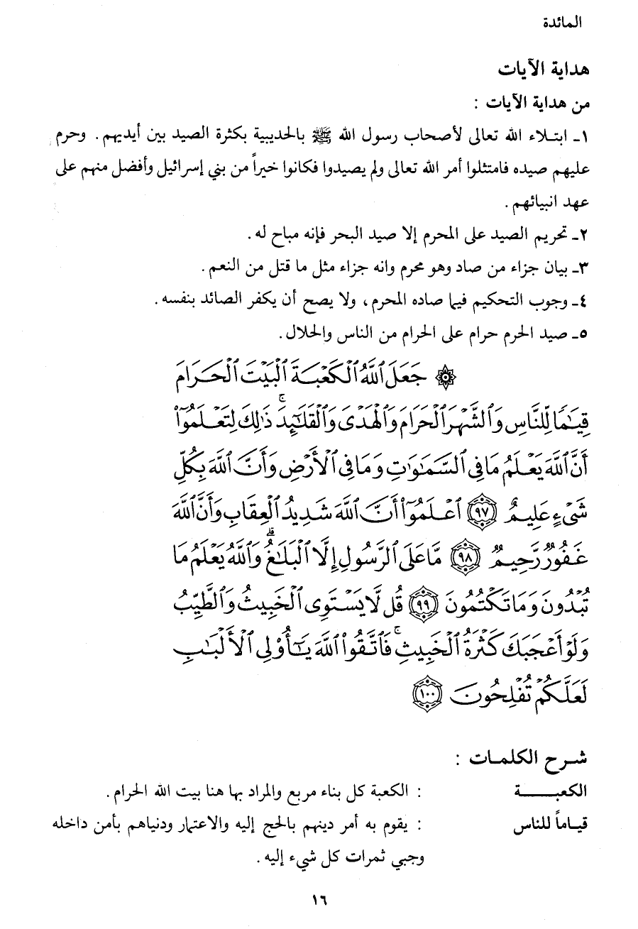 جَعَلَ اللهُ الْكَعْبَةَ الْبَيْتَ الْحَرَامَ قِيَامًا لِّلنَّاسِ وَالشَّهْرَ الْحَرَامَ وَالْهَدْيَ وَالْقَلاَئِدَ ذَلِكَ لِتَعْلَمُواْ أَنَّ اللهَ يَعْلَمُ مَا فِي السَّمَاوَاتِ وَمَا فِي الأَرْضِ وَأَنَّ اللهَ بِكُلِّ شَيْءٍ عَلِيمٌ (97) اعْلَمُواْ أَنَّ اللهَ شَدِيدُ الْعِقَابِ وَأَنَّ اللهَ غَفُورٌ رَّحِيمٌ (98) مَّا عَلَى الرَّسُولِ إِلاَّ الْبَلاَغُ وَاللهُ يَعْلَمُ مَا تُبْدُونَ وَمَا تَكْتُمُونَ (99) قُل لاَّ يَسْتَوِي الْخَبِيثُ وَالطَّيِّبُ وَلَوْ أَعْجَبَكَ كَثْرَةُ الْخَبِيثِ فَاتَّقُواْ اللهَ يَا أُوْلِي الأَلْبَابِ لَعَلَّكُمْ تُفْلِحُونَ (100)