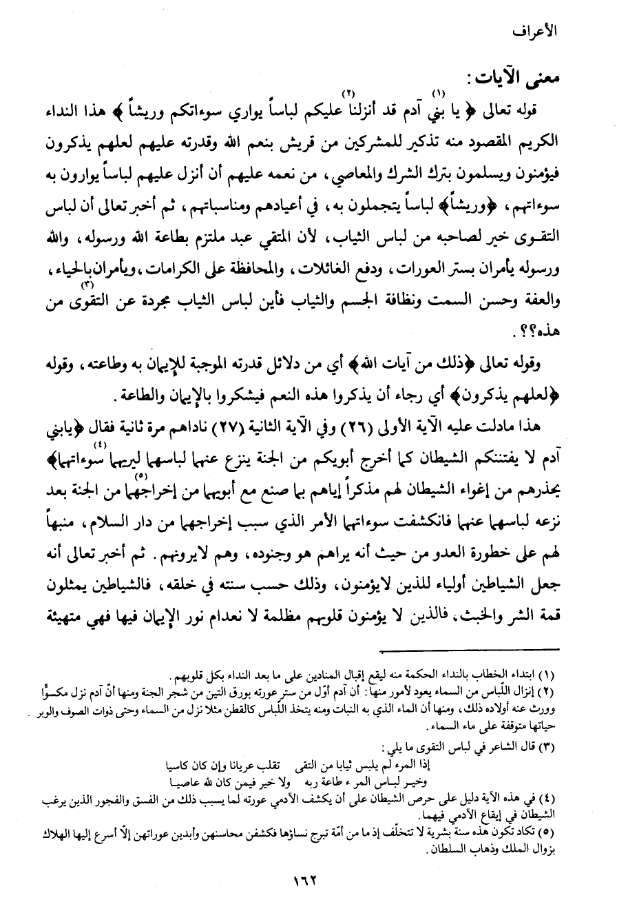 قوله تعالى {يا بني1 آدم قد نزلنا2 عليكم لباساً يواري سوءاتكم وريشاً} هذا النداء الكريم المقصود منه تذكير للمشركين من قريش بنعم الله وقدرته عليهم لعلهم يذكرون فيؤمنون ويسلمون بترك الشرك والمعاصي، من نعمه عليهم أن أنزل عليهم لباساً يوارون به سوءاتهم، {وريشاً} لباساً يتجملون به، في أعيادهم ومناسباتهم، ثم أخبر تعالى أن لباس التقوى خير لصاحبه من لباس الثياب، لأن المتقي عبد ملتزم بطاعة الله ورسوله، والله ورسوله يأمران بستر العورات، ودفع الغائلات، والمحافظة على الكرامات، ويأمران بالحياء، والعفة وحسن السمت ونظافة الجسم والثياب فأين لباس الثياب مجردة عن التقوى3 من هذه؟؟.