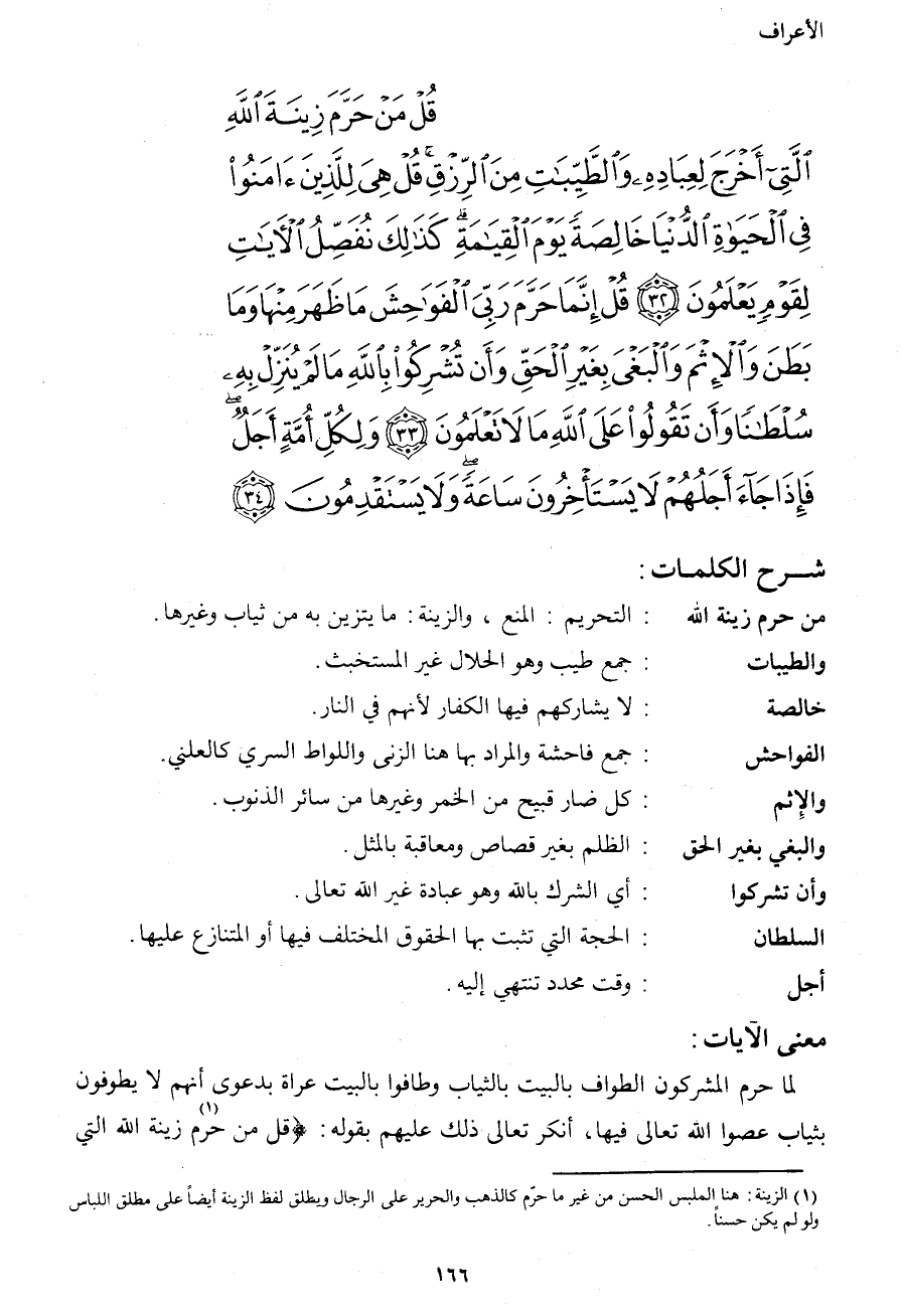 قُلْ مَنْ حَرَّمَ زِينَةَ اللهِ الَّتِيَ أَخْرَجَ لِعِبَادِهِ وَالْطَّيِّبَاتِ مِنَ الرِّزْقِ قُلْ هِي لِلَّذِينَ آمَنُواْ فِي الْحَيَاةِ الدُّنْيَا خَالِصَةً يَوْمَ الْقِيَامَةِ كَذَلِكَ نُفَصِّلُ الآيَاتِ لِقَوْمٍ يَعْلَمُونَ (32) قُلْ إِنَّمَا حَرَّمَ رَبِّيَ الْفَوَاحِشَ مَا ظَهَرَ مِنْهَا وَمَا بَطَنَ وَالإِثْمَ وَالْبَغْيَ بِغَيْرِ الْحَقِّ وَأَن تُشْرِكُواْ بِاللهِ مَا لَمْ يُنَزِّلْ بِهِ سُلْطَانًا وَأَن تَقُولُواْ عَلَى اللهِ مَا لاَ تَعْلَمُونَ (33) وَلِكُلِّ أُمَّةٍ أَجَلٌ فَإِذَا جَاء أَجَلُهُمْ لاَ يَسْتَأْخِرُونَ سَاعَةً وَلاَ يَسْتَقْدِمُونَ (34)