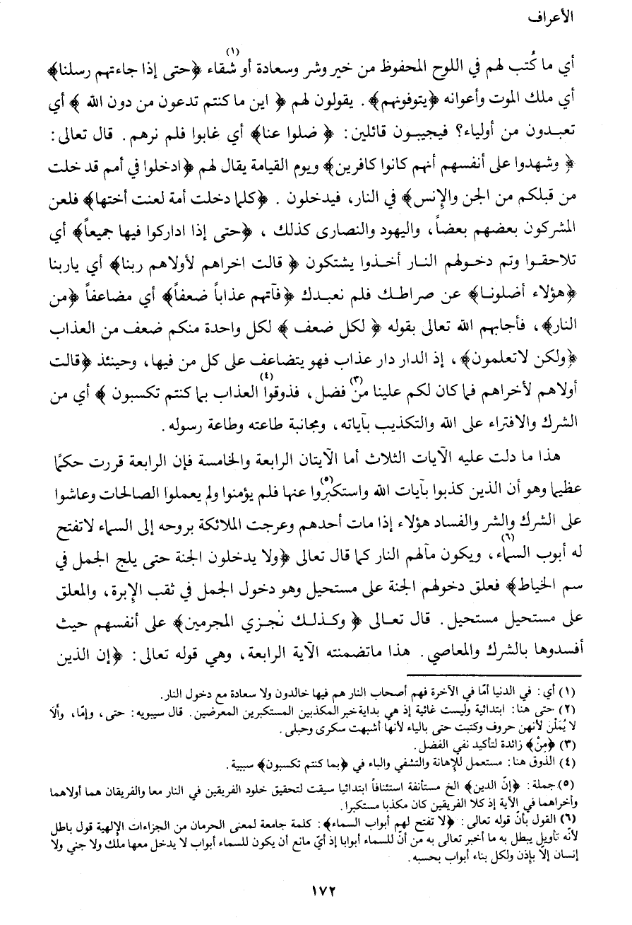 هذا ما دلت عليه الآيات الثلاث أما الآيتان الرابعة والخامسة فإن الرابعة قررت حكماً عظيماً وهو أن الذين كذبوا بآيات الله واستكبروا5 عنها فلم يؤمنوا ولم يعملوا الصالحات وعاشوا عاد الشرك والشر والفساد هؤلاء إذا مات أحدهم وعرجت الملائكة بروحه إلى السماء لا تفتح له أبوب السماء6، ويكون مآلهم النار كما قال تعالى {ولا يدخلون الجنة حتى يلج الجمل في سم الخياط} فعلق دخولهم الجنة على مستحيل وهو دخول الجمل في ثقب الإبرة، والمعلق عاد مستحيل مستحيل. قال تعالى: {وكذلك نجزي المجرمين} على أنفسهم حيث أفسدوها بالشرك والمعاصي. هذا ما تضمنته الآية الرابعة، وهي قوله تعالى: {إن الذين