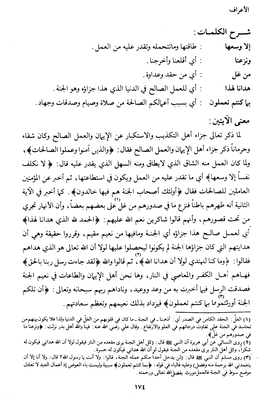 1 الغل: الحقد الكامن في الصدر أي: أذهبنا- في الجنة- ما كان في قلوبهم من الغل في الدنيا ولذا فلا يكون لهم من تحاسد في الجنة على تفاوت درجاتهم في العلو والارتفاع. وقال علي رضي الله عنه: فينا والله أهل بدر نزلت: {ونزعنا ما في صدورهم من غل} .