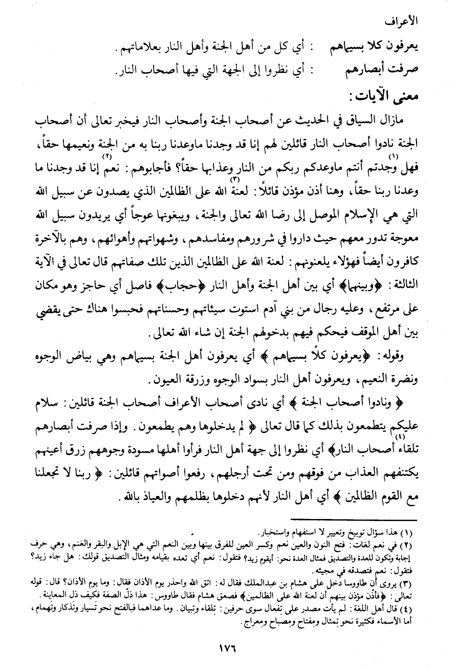 مازال السياق في الحديث عن أصحاب الجنة وأصحاب النار فيخبر تعالى أن أصحاب الجنة نادوا أصحاب النار قائلين لهم إنا قد وجدنا ما وعدنا ربنا به هن الجنة ونعيمها حقاً، فهل1 وجدتم أنتم ما وعدكم ربكم من النار وعذابها حقاً؟ فأجابوهم: نعم2 إنا قد وجدنا ما وعدنا ربنا حقاً، وهنا أذن مؤذن قائلاً: لعنة3 الله على الظالمين الذين يصدون عن سبيل الله التي هي الإسلام الموصل إلى رضا الله تعالى والجنة، ويبغونها عوجاً أي يريدون سبيل الله معوجة تدور معهم حيث داروا في شرورهم ومفاسدهم، وشهواتهم وأهوائهم، وهم بالآخرة كافرون أيضاً فهؤلاء يلعنونهم: لعنة الله على الظالمين الذين تلك صفاتهم قال تعالى في الآية الثالثة: {وبينهما} أي بين أهل الجنة وأهل النار {حجاب} فاصل أي حاجز وهو مكان على مرتفع، وعليه رجال من بني آدم استوت سيئاتهم وحسناتهم فحبسوا هناك حتى يقضي بين أهل الموقف فيحكم فيهم بدخولهم الجنة إن شاء الله تعالى.