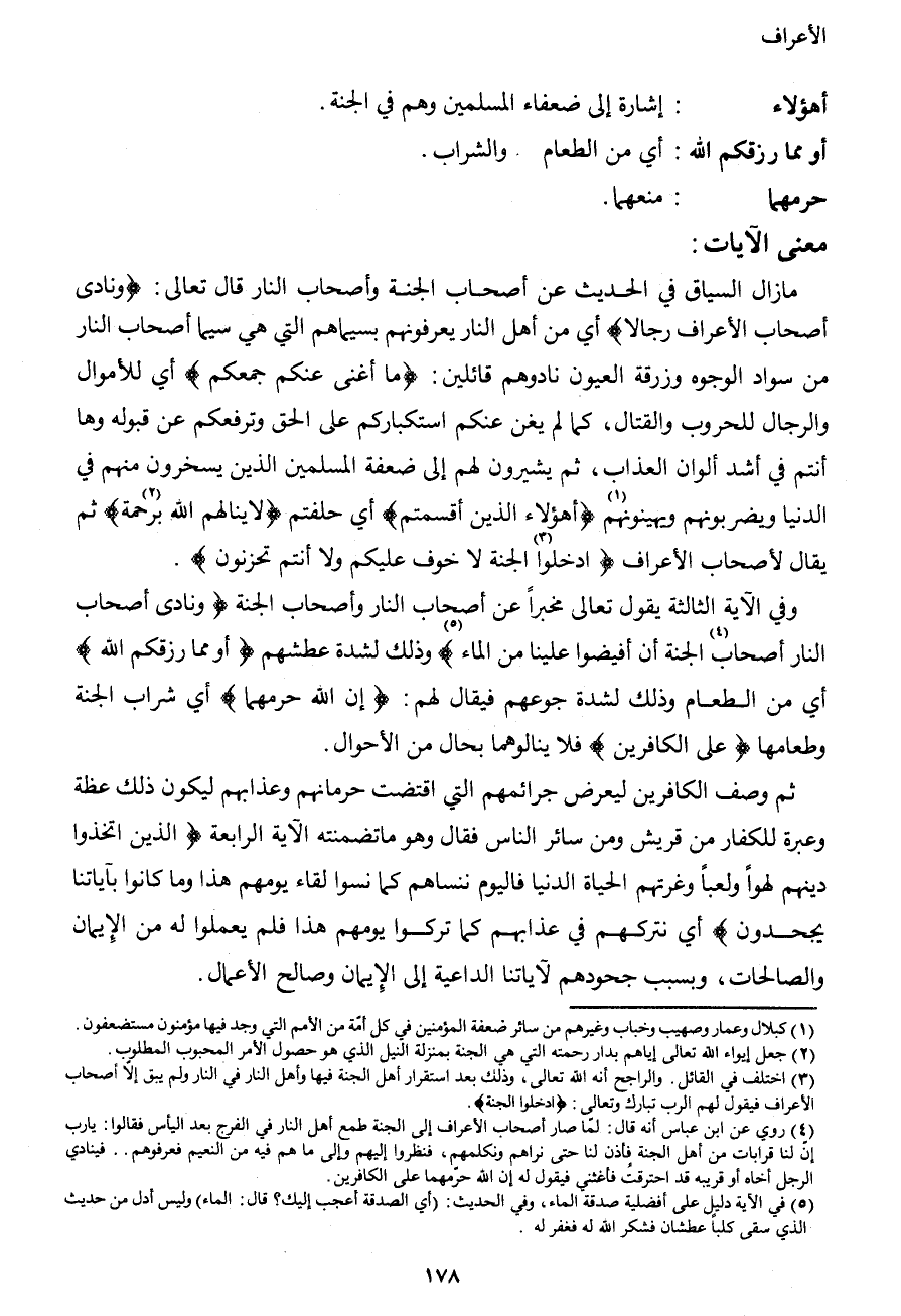 4 روي عن ابن عباس أنه قال: لما صار أصحاب الأعراف إلى الجنة طمع أهل النار في الفرج بعد اليأس فقالوا: يا رب إنّ لنا قرابات من أهل الجنة فأذن لنا حتى نراهم ونكلمهم، فنظروا إليهم وإلى ما هم فيه من النعيم فعرفوهم.. فينادي الرجل أخاه أو قريبه قد احترقتُ فأغثني فيقول له إن الله حرّمهما على الكافرين.