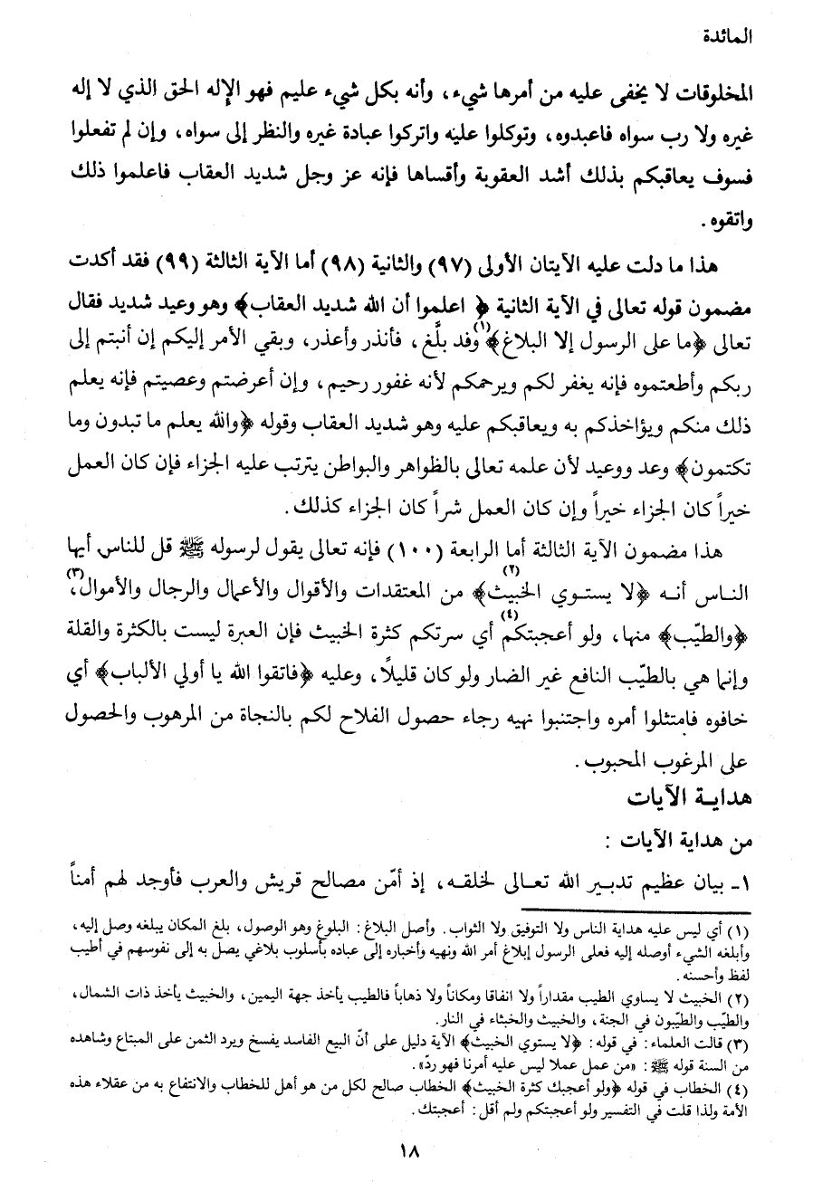 هذا ما دلت عليه الآيتان الأولى (97) والثانية (98) أما الآية الثالثة (99) فقد أكدت مضمون قوله تعالى في الآية الثانية {اعلموا أن الله شديد العقاب} وهو وعيد شديد فقال تعالى {ما على الرسول إلا البلاغ} 1 وقد بلَّغ، فأنذر وأعذر، وبقي الأمر إليكم إن أنبتم إلى ربكم وأطعتموه فإنه يغفر لكم ويرحمكم لأنه غفور رحيم، وإن أعرضتم وعصيتم فإنه يعلم ذلك منكم ويؤاخذكم به ويعاقبكم عليه وهو شديد العقاب وقوله {والله يعلم ما تبدون وما تكتمون} وعد ووعيد لأن علمه تعالى بالظواهر والبواطن يترتب عليه الجزاء فإن كان العمل خيراً كان الجزاء خيراً وإن كان العمل شراً كان الجزاء كذلك.