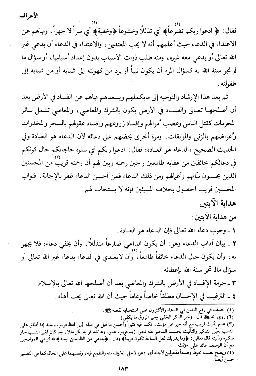 2- بيان آداب الدعاء وهو: أن يكون الداعي ضارعاً متذللاً، وأن يخفي دعاءه فلا يجهر به، وأن يكون حال الدعاء خائفاً طامعاً4، وأن لا يعتدي في الدعاء بدعاء غير الله تعالى أو سؤال ما لم تجر سنة الله بإعطائه.