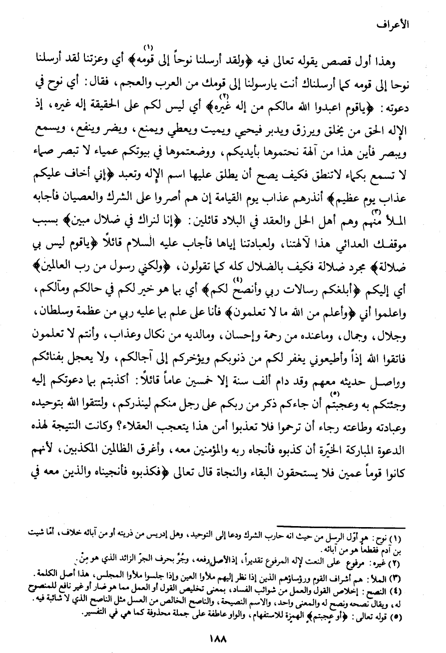 وهذا أول قصص بقوله تعالى فيه {ولقد أرسلنا نوحاً إلى قومه1} أي وعزتنا لقد أرسلنا نوحاً إلى قومه كما أرسلناك أنت يا رسولنا إلى قومك من العرب والعجم، فقال: أي نوح في دعوته: {يا قوم اعبدوا الله مالكم من إله غيره2} أي ليس لكم على الحقيقة إله غيره، إذ إلإله الحق من يخلق ويرزق ويدبر فيحيي ويميت ويعطي ويمنع، ويضر وينفع، ويسمع ويبصر فأين هذا من آلهة نحتموها بأيديكم، ووضعتموها في بيوتكم عمياء لا تبصر صماء لا تسمع بكماء لا تنطق فكيف يصح أن يطلق عليها اسم الإله وتعبد {إني أخاف عليكم عذاب يوم عظيم} أنذرهم عذاب يوم القيامة إن هم أصروا على الشرك والعصيان فأجابه الملأ3 منهم وهم أهل الحل والعقد في البلاد قائلين: {إنا لنراك في ضلال مبين} بسبب موقفك العدائي هذا لآلهتنا، ولعبادتنا إياها فأجاب عليه السلام قائلاً: {يا قوم ليس بي ضلالة} مجرد ضلالة فكيف بالضلال كله كما تقولون، {ولكني رسول من رب العالمين} أي إليكم {أبلغكم رسالات ربي وأنصح4 لكم} أي بما هو خير لكم في حالكم ومآلكم، واعلموا أني {وأعلم من الله ما لا تعلمون} فأنا على علم بما عليه ربي من عظمة وسلطان، وجلال، وجمال، وما عنده من رحمة وإحسان، وما لديه من نكال وعذاب، وأنتم لا تعلمون فاتقوا الله إذاً وأطيعوني يغفر لكم من ذنوبكم ويؤخركم إلى آجالكم، ولا يعجل بفنائكم وواصل حديثه معهم وقد دام ألف سنة إلا خمسين عاماً قائلاً: أكذبتم بما دعوتكم إليه وجئتكم به وعجبتم5 أن جاءكم ذكر من ربكم على رجل منكم لينذركم، ولتتقوا الله بتوحيده وعبادته وطاعته رجاء أن ترحموا فلا تعذبوا أمن هذا يتعجب العقلاء؟ وكانت النتيجة لهذه الدعوة المباركة الخيّرة أن كذبوه فأنجاه ربه والمؤمنين معه، وأغرق الظالمين المكذبين، لأنهم كانوا قوماً عمين فلا يستحقون البقاء والنجاة قال تعالى {فكذبوه فأنجيناه والذين معه في