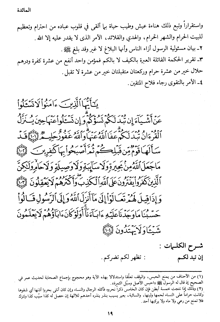 يَا أَيُّهَا الَّذِينَ آمَنُواْ لاَ تَسْأَلُواْ عَنْ أَشْيَاء إِن تُبْدَ لَكُمْ تَسُؤْكُمْ وَإِن تَسْأَلُواْ عَنْهَا حِينَ يُنَزَّلُ الْقُرْآنُ تُبْدَ لَكُمْ عَفَا اللهُ عَنْهَا وَاللهُ غَفُورٌ حَلِيمٌ (101) قَدْ سَأَلَهَا قَوْمٌ مِّن قَبْلِكُمْ ثُمَّ أَصْبَحُواْ بِهَا كَافِرِينَ (102) مَا جَعَلَ اللهُ مِن بَحِيرَةٍ وَلاَ سَآئِبَةٍ وَلاَ وَصِيلَةٍ وَلاَ حَامٍ وَلَكِنَّ الَّذِينَ كَفَرُواْ يَفْتَرُونَ عَلَى اللهِ الْكَذِبَ وَأَكْثَرُهُمْ لاَ يَعْقِلُونَ (103) وَإِذَا قِيلَ لَهُمْ تَعَالَوْاْ إِلَى مَا أَنزَلَ اللهُ وَإِلَى الرَّسُولِ قَالُواْ حَسْبُنَا مَا وَجَدْنَا عَلَيْهِ آبَاءنَا أَوَلَوْ كَانَ آبَاؤُهُمْ لاَ يَعْلَمُونَ شَيْئًا وَلاَ يَهْتَدُونَ (104)