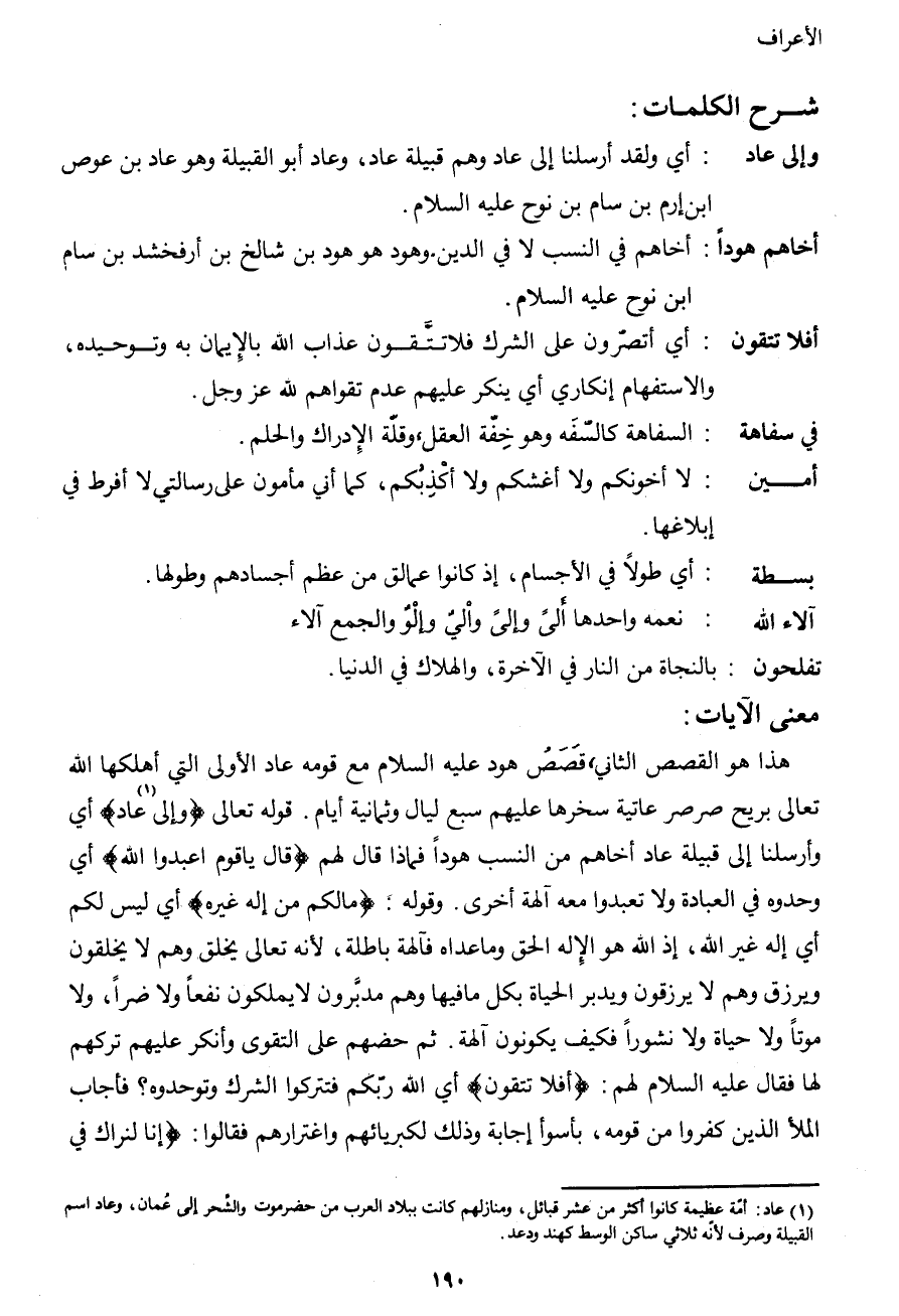 1 عاد: آمّة عظيمة كانوا أكثر من عشر قبائل، ومنازلهم كانت ببلاد العرب من حضرموت والشّحر إلى عُمان، وعاد اسم القبيلة وصرف لأنّه ثلاثي ساكن الوسط كهند ودعد.