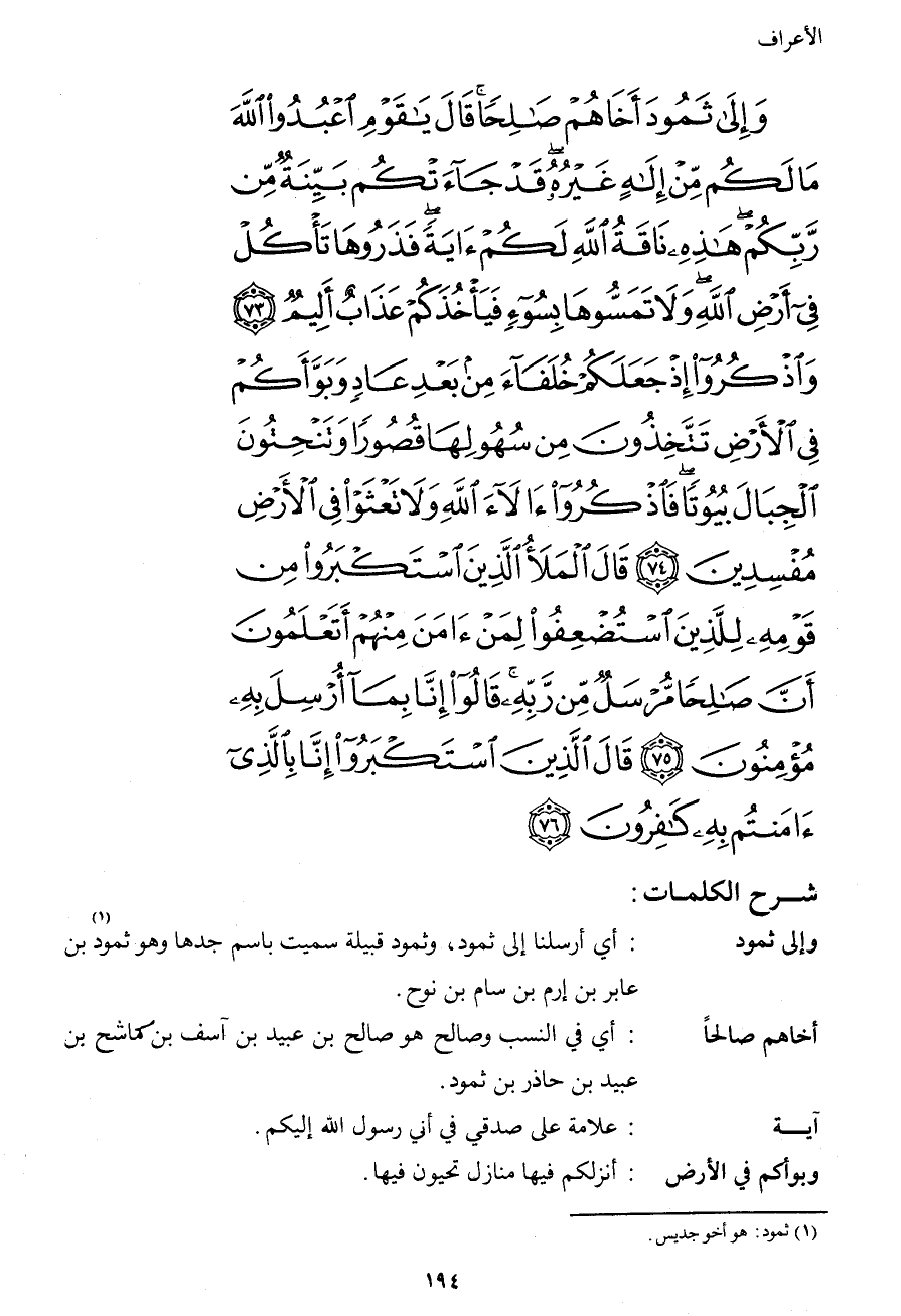 وَإِلَى ثَمُودَ أَخَاهُمْ صَالِحًا قَالَ يَا قَوْمِ اعْبُدُواْ اللهَ مَا لَكُم مِّنْ إِلَهٍ غَيْرُهُ قَدْ جَاءتْكُم بَيِّنَةٌ مِّن رَّبِّكُمْ هَذِهِ نَاقَةُ اللهِ لَكُمْ آيَةً فَذَرُوهَا تَأْكُلْ فِي أَرْضِ اللهِ وَلاَ تَمَسُّوهَا بِسُوَءٍ فَيَأْخُذَكُمْ عَذَابٌ أَلِيمٌ (73) وَاذْكُرُواْ إِذْ جَعَلَكُمْ خُلَفَاء مِن بَعْدِ عَادٍ وَبَوَّأَكُمْ فِي الأَرْضِ تَتَّخِذُونَ مِن سُهُولِهَا قُصُورًا وَتَنْحِتُونَ الْجِبَالَ بُيُوتًا فَاذْكُرُواْ آلاء اللهِ وَلاَ تَعْثَوْا فِي الأَرْضِ مُفْسِدِينَ (74) قَالَ الْمَلأُ الَّذِينَ اسْتَكْبَرُواْ مِن قَوْمِهِ لِلَّذِينَ اسْتُضْعِفُواْ لِمَنْ آمَنَ مِنْهُمْ أَتَعْلَمُونَ أَنَّ صَالِحًا مُّرْسَلٌ مِّن رَّبِّهِ قَالُواْ إِنَّا بِمَا أُرْسِلَ بِهِ مُؤْمِنُونَ (75) قَالَ الَّذِينَ اسْتَكْبَرُواْ إِنَّا بِالَّذِيَ آمَنتُمْ بِهِ كَافِرُونَ (76)