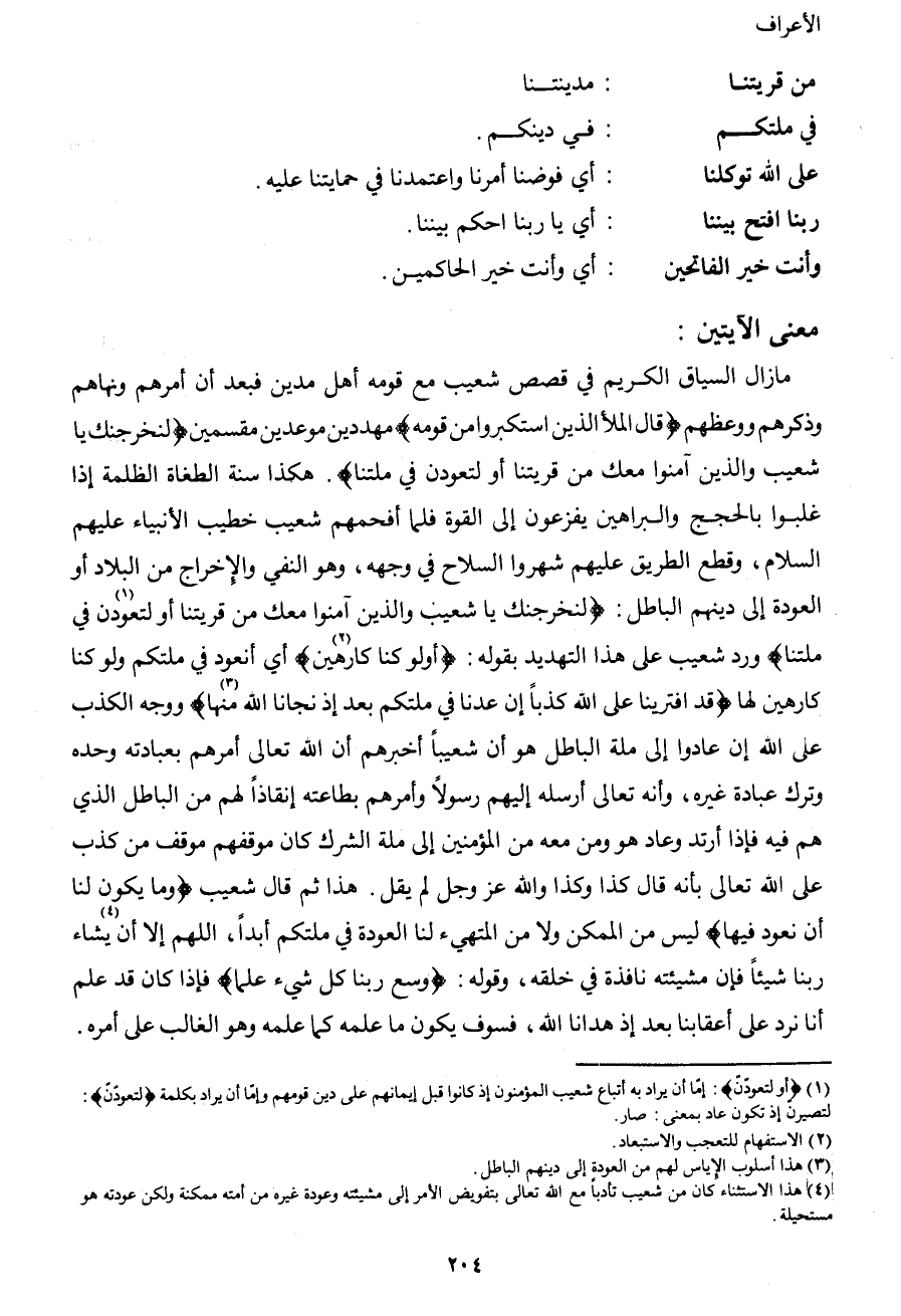 1 {أو لتعودّنّ} : إمّا أن يراد به أتباع شعيب المؤمنون إذ كانوا قبل إيمانهم على دين قومهم وإمّا أن يراد بكلمة {لتعودّنّ} : لتصيرن إذ تكون عاد بمعنى: صار.