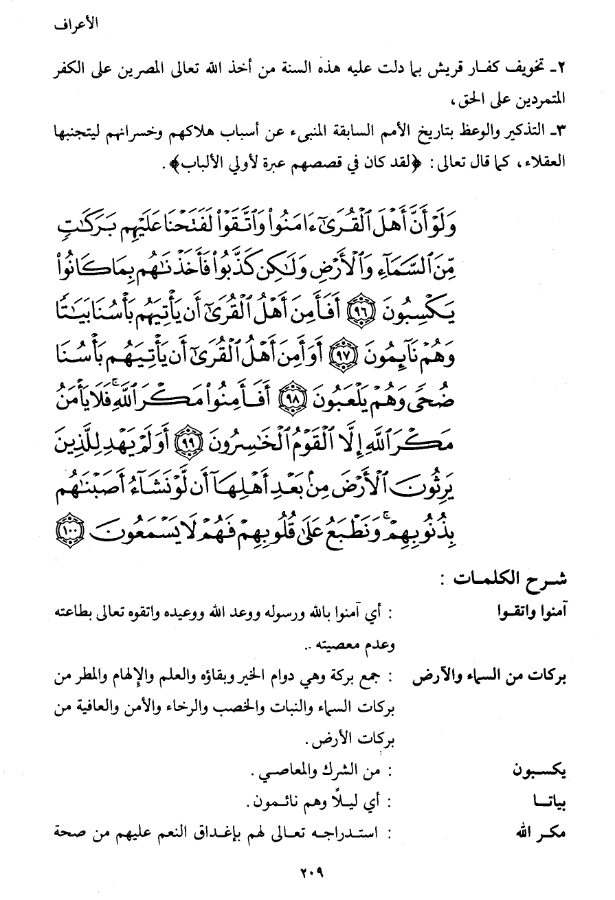 وَلَوْ أَنَّ أَهْلَ الْقُرَى آمَنُواْ وَاتَّقَواْ لَفَتَحْنَا عَلَيْهِم بَرَكَاتٍ مِّنَ السَّمَاء وَالأَرْضِ وَلَكِن كَذَّبُواْ فَأَخَذْنَاهُم بِمَا كَانُواْ يَكْسِبُونَ (96) أَفَأَمِنَ أَهْلُ الْقُرَى أَن يَأْتِيَهُمْ بَأْسُنَا بَيَاتاً وَهُمْ نَآئِمُونَ (97) أَوَ أَمِنَ أَهْلُ الْقُرَى أَن يَأْتِيَهُمْ بَأْسُنَا ضُحًى وَهُمْ يَلْعَبُونَ (98) أَفَأَمِنُواْ مَكْرَ اللهِ فَلاَ يَأْمَنُ مَكْرَ اللهِ إِلاَّ الْقَوْمُ الْخَاسِرُونَ (99) أَوَلَمْ يَهْدِ لِلَّذِينَ يَرِثُونَ الأَرْضَ مِن بَعْدِ أَهْلِهَا أَن لَّوْ نَشَاء أَصَبْنَاهُم بِذُنُوبِهِمْ وَنَطْبَعُ عَلَى قُلُوبِهِمْ فَهُمْ لاَ يَسْمَعُونَ (100)