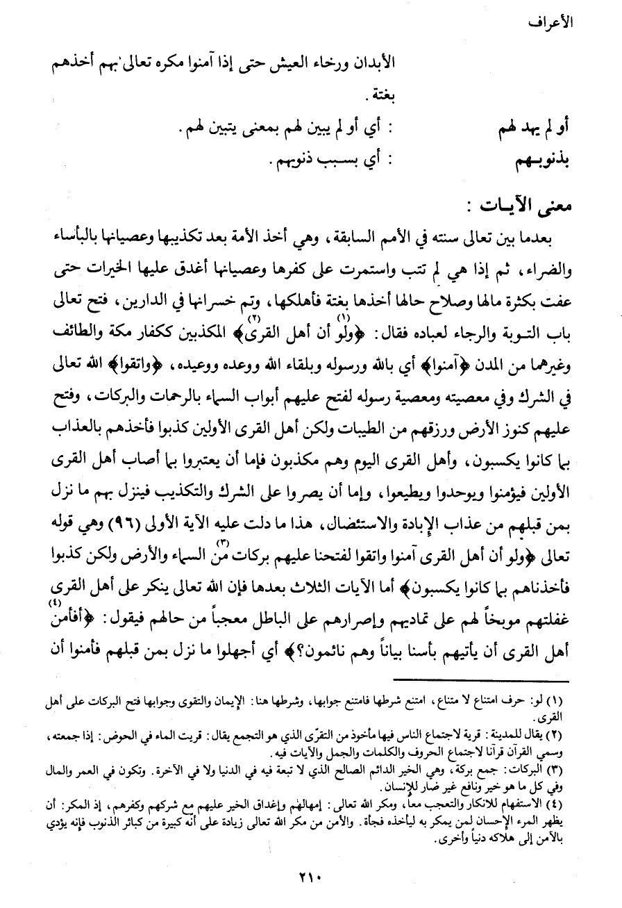 بعدما بين تعالى سنته في الأمم السابقة، وهي أخذ الأمة بعد تكذيبها وعصيانها بالبأساء والضراء، ثم إذا هي لم تتب واستمرت على كفرها وعصيانها أغدق عليها الخيرات حتى عفت بكثرة ما لها وصلاح حالها أخذها بغتة فأهلكها، وتم خسرانها في الدارين، فتح تعالى باب التوبة والرجاء لعباده فقال: {ولو1 أن أهل القرى2} المكذبين ككفار مكة والطائف وغيرهما من المدن {آمنوا} أي بالله ورسوله وبلقاء الله ووعده ووعيده، {واتقوا} الله تعالى في الشرك وفي معصيته ومعصية رسوله لفتح عليهم أبواب السماء بالرحمات والبركات، وفتح عليهم كنوز الأرض ورزقهم من الطيبات ولكن أهل القرى الأولين كذبوا فأخذهم بالعذاب بما كانوا يكسبون، وأهل القرى اليوم وهم مكذبون فإما أن يعتبروا بما أصاب أهل القرى الأولين فيؤمنوا ويوحدوا ويطيعوا، وإما أن يصروا على الشرك والتكذيب فينزل بهم ما نزل بمن قبلهم من عذاب الإبادة والاستئصال، هذا ما دلت عليه الآية الأولى (96) وهي قوله تعالى {ولو أن أهل القرى آمنوا واتقوا لفتحنا عليهم بركات3 من السماء والأرض ولكن كذبوا فأخذناهم بما كانوا يكسبون} أما الآيات الثلاث بعدها فإن الله تعالى ينكر على أهل القرى غفلتهم موبخاً لهم على تماديهم وإصرارهم على الباطل معجباً من حالهم فيقول: {أفأمن4 أهل القرى أن يأتيهم بأسنا بياتاً وهم نائمون؟} أي أجهلوا ما نزل بمن قبلهم فأمنوا أن