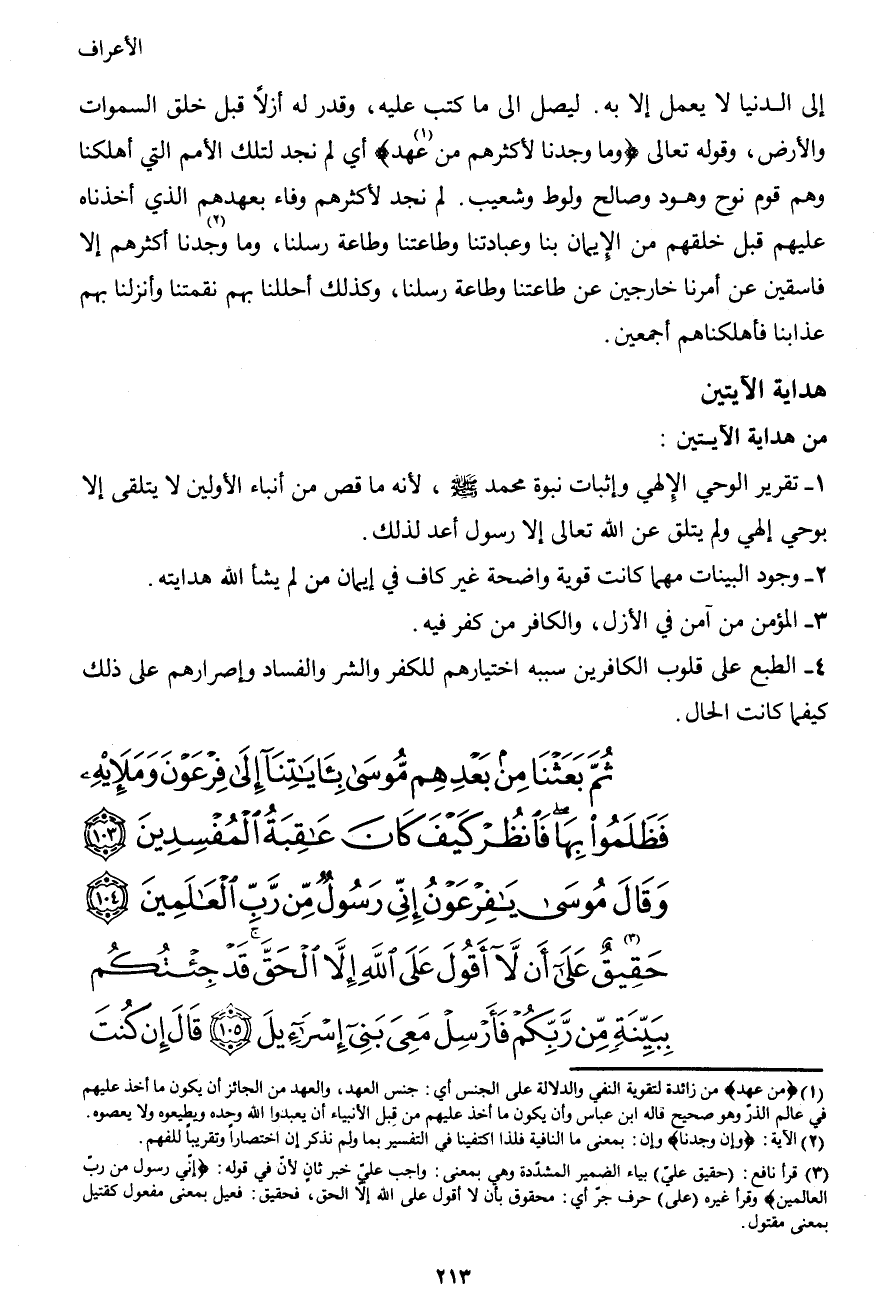 ثُمَّ بَعَثْنَا مِن بَعْدِهِم مُّوسَى بِآيَاتِنَا إِلَى فِرْعَوْنَ وَمَلَئِهِ فَظَلَمُواْ بِهَا فَانظُرْ كَيْفَ كَانَ عَاقِبَةُ الْمُفْسِدِينَ (103) وَقَالَ مُوسَى يَا فِرْعَوْنُ إِنِّي رَسُولٌ مِّن رَّبِّ الْعَالَمِينَ (104) حَقِيقٌ3 عَلَى أَن لاَّ أَقُولَ عَلَى اللهِ إِلاَّ الْحَقَّ قَدْ جِئْتُكُم بِبَيِّنَةٍ مِّن رَّبِّكُمْ فَأَرْسِلْ مَعِيَ بَنِي إِسْرَائِيلَ (105) قَالَ إِن كُنتَ