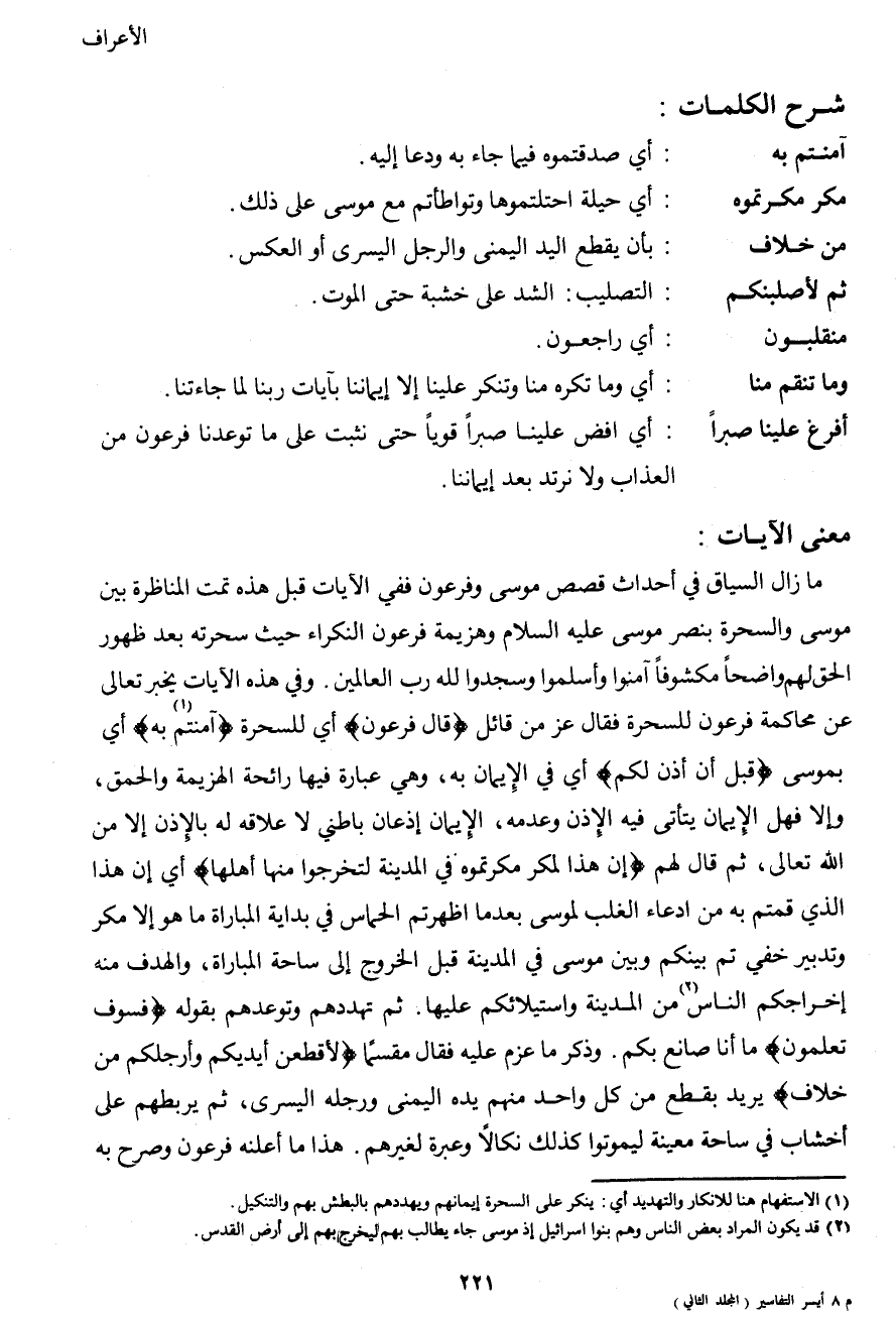ما زال السياق في أحداث قصص موسى وفرعون ففي الآيات قبل هذه تمت المناظرة بين موسى والسحرة بنصر موسى عليه السلام وهزيمة فرعون النكراء حيث سحرته بعد ظهور الحق لهم واضحاً مكشوفاً آمنوا وأسلموا وسجدوا لله رب العالمين. وفي هذه الآيات يخبر تعالى عن محاكمة فرعون للسحرة فقال عز من قائل {قال فرعون} أي للسحرة {آمنتم1 به} أي بموسى {قبل أن آذن لكم} أي في الإيمان به، وهي عبارة فيها رائحة الهزيمة والحمق، وإلا فهل الإيمان يتأتي فيه الإذن وعدمه، الإيمان إذعان باطني لا علاقة له بالإذن إلا من الله تعالى، ثم قال لهم {إن هذا لمكر مكرتموه في المدينة لتخرجوا منها أهلها} أي إن هذا الذي قمتم به من ادعاء الغلب لموسى بعدما أظهرتم الحماس في بداية المباراة ما هو إلا مكرا وتدبير خفي تم بينكم وبين موسى في المدينة قبل الخروج إلى ساحة المباراة، والهدف منه إخراجكم الناس2 من المدينة واستيلائكم عليها. ثم تهددهم وتوعدهم بقوله {فسوف تعلمون} ما أنا صانع بكم. وذكر ما عزم عليه فقال مقسماً {لأقطعن أيديكم وأرجلكم من خلاف} يريد بقطع من كل واحد منهم يده اليمنى ورجله اليسرى، ثم يربطهم على أخشاب في ساحة معينة ليموتوا كذلك نكالاً وعبرة لغيرهم. هذا ما أعلنه فرعون وصرح به
