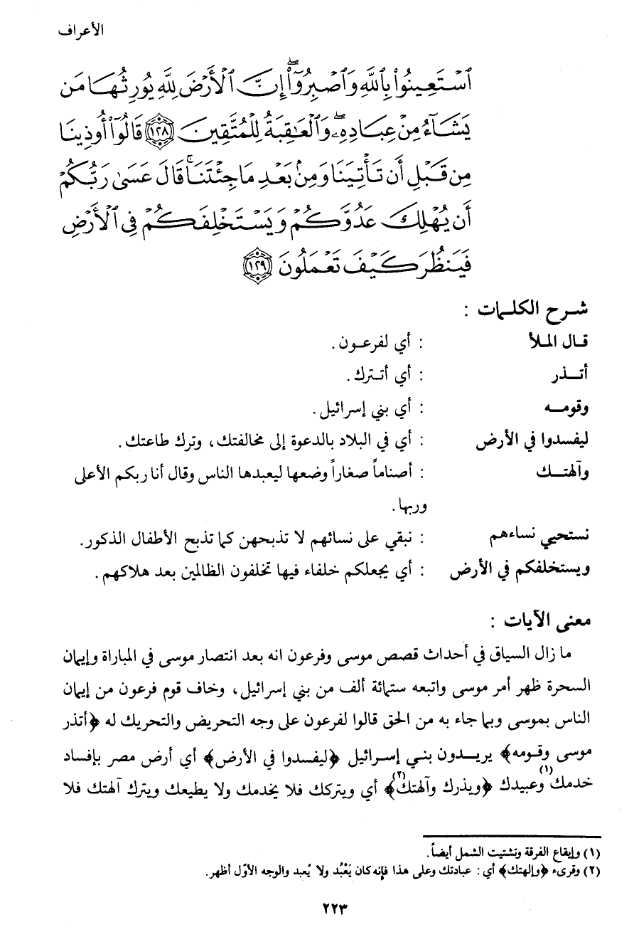 اسْتَعِينُوا بِاللهِ وَاصْبِرُواْ إِنَّ الأَرْضَ لِلّهِ يُورِثُهَا مَن يَشَاء مِنْ عِبَادِهِ وَالْعَاقِبَةُ لِلْمُتَّقِينَ (128) قَالُواْ أُوذِينَا مِن قَبْلِ أَن تَأْتِينَا وَمِن بَعْدِ مَا جِئْتَنَا قَالَ عَسَى رَبُّكُمْ أَن يُهْلِكَ عَدُوَّكُمْ وَيَسْتَخْلِفَكُمْ فِي الأَرْضِ فَيَنظُرَ كَيْفَ تَعْمَلُونَ (129)