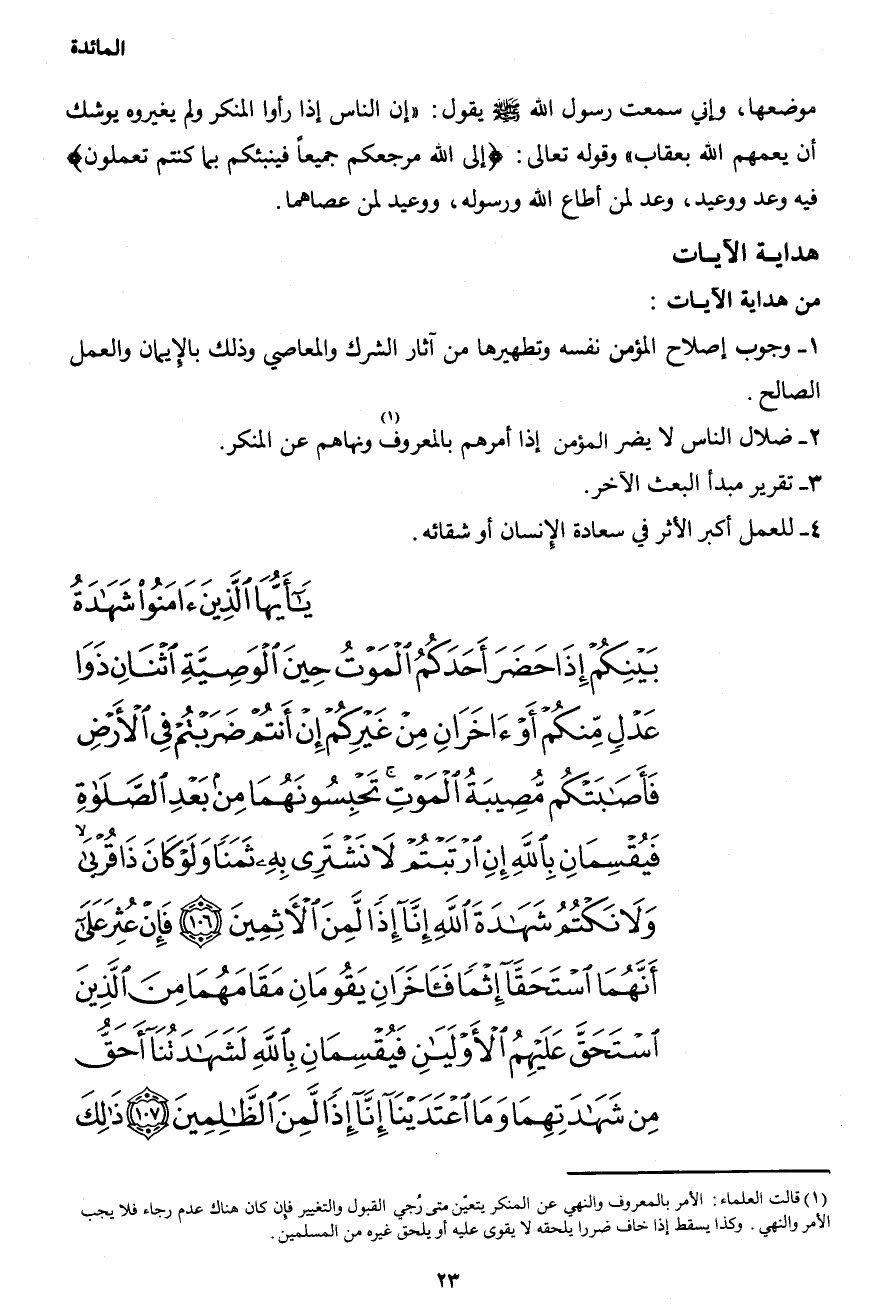 يِا أَيُّهَا الَّذِينَ آمَنُواْ شَهَادَةُ بَيْنِكُمْ إِذَا حَضَرَ أَحَدَكُمُ الْمَوْتُ حِينَ الْوَصِيَّةِ اثْنَانِ ذَوَا عَدْلٍ مِّنكُمْ أَوْ آخَرَانِ مِنْ غَيْرِكُمْ إِنْ أَنتُمْ ضَرَبْتُمْ فِي الأَرْضِ فَأَصَابَتْكُم مُّصِيبَةُ الْمَوْتِ تَحْبِسُونَهُمَا مِن بَعْدِ الصَّلاَةِ فَيُقْسِمَانِ بِاللهِ إِنِ ارْتَبْتُمْ لاَ نَشْتَرِي بِهِ ثَمَنًا وَلَوْ كَانَ ذَا قُرْبَى وَلاَ نَكْتُمُ شَهَادَةَ اللهِ إِنَّا إِذًا لَّمِنَ الآثِمِينَ (106) فَإِنْ عُثِرَ عَلَى أَنَّهُمَا اسْتَحَقَّا إِثْمًا فَآخَرَانِ يِقُومَانُ مَقَامَهُمَا مِنَ الَّذِينَ اسْتَحَقَّ عَلَيْهِمُ الأَوْلَيَانِ فَيُقْسِمَانِ بِاللهِ لَشَهَادَتُنَا أَحَقُّ مِن شَهَادَتِهِمَا وَمَا اعْتَدَيْنَا إِنَّا إِذًا لَّمِنَ الظَّالِمِينَ (107) ذَلِكَ