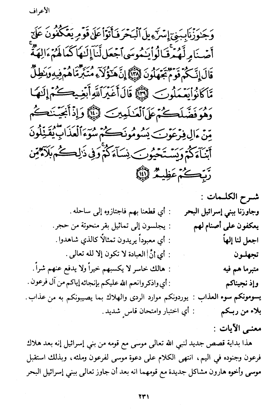 وَجَاوَزْنَا بِبَنِي إِسْرَآئِيلَ الْبَحْرَ فَأَتَوْاْ عَلَى قَوْمٍ يَعْكُفُونَ عَلَى أَصْنَامٍ لَّهُمْ قَالُواْ يَا مُوسَى اجْعَل لَّنَا إِلَهًا كَمَا لَهُمْ آلِهَةٌ قَالَ إِنَّكُمْ قَوْمٌ تَجْهَلُونَ (138) إِنَّ هَؤُلاء مُتَبَّرٌ مَّا هُمْ فِيهِ وَبَاطِلٌ مَّا كَانُواْ يَعْمَلُونَ (139) قَالَ أَغَيْرَ اللهِ أَبْغِيكُمْ إِلَهًا وَهُوَ فَضَّلَكُمْ عَلَى الْعَالَمِينَ (140) وَإِذْ أَنجَيْنَاكُم مِّنْ آلِ فِرْعَونَ يَسُومُونَكُمْ سُوَءَ الْعَذَابِ يُقَتِّلُونَ أَبْنَاءكُمْ وَيَسْتَحْيُونَ نِسَاءكُمْ وَفِي ذَلِكُم بَلاء مِّن رَّبِّكُمْ عَظِيمٌ (141)