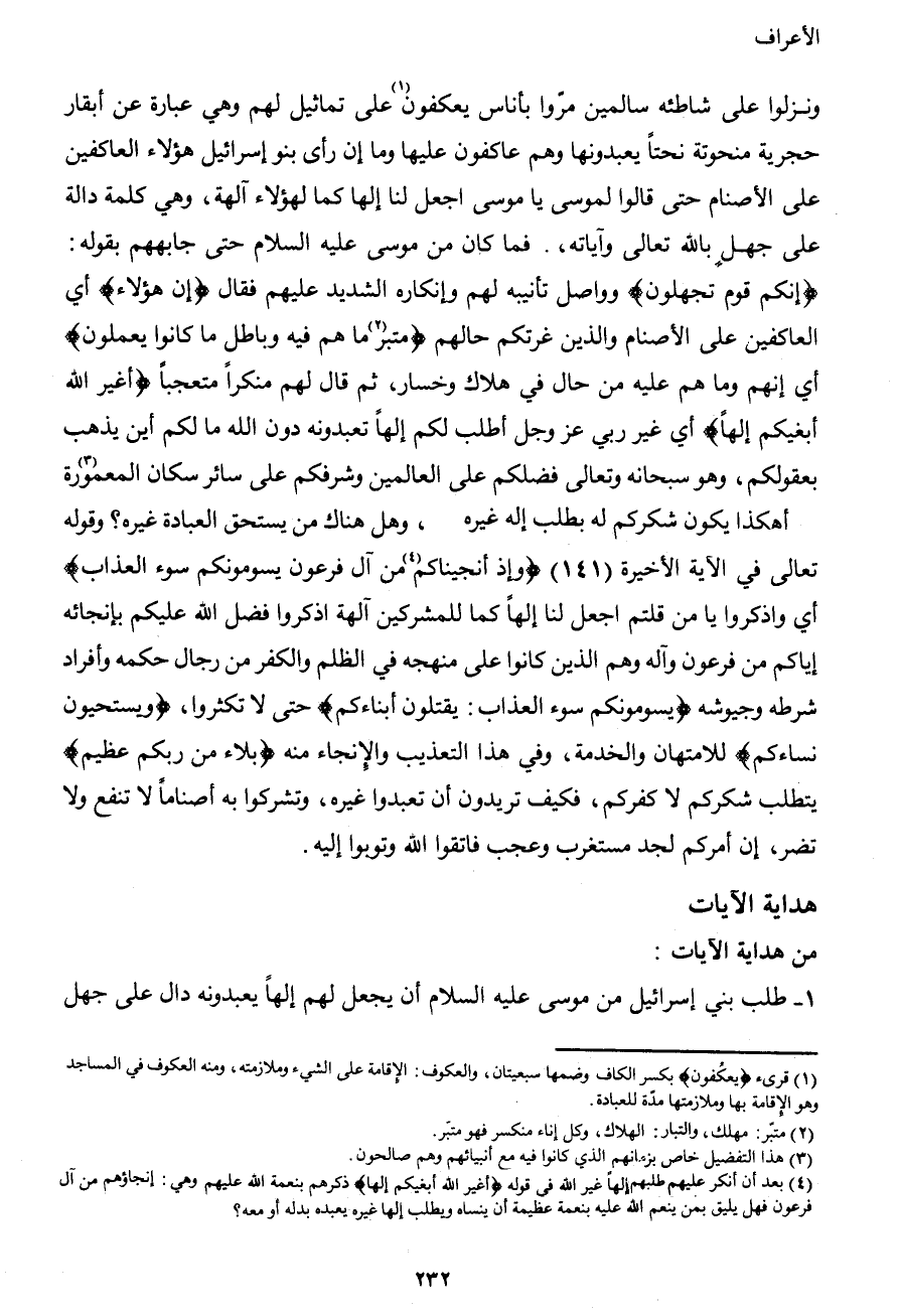 ونزلوا على شاطئه سالمين مرّوا بأناس يعكفون1 على تماثيل لهم وهي عبارة عن أبقار حجرية منحوتة نحتاً يعبدونها وهم عاكفون عليها وما إن رأى بنو إسرائيل هؤلاء العاكفين على الأصنام حتى قالوا لموسى يا موسى اجعل لنا إلهاً كما لهؤلاء آلهة، وهي كلمة دالة على جهلٍ بالله تعالى وآياته، فما كان من موسى عليه السلام حتى جابههم بقوله: {إنكم قوم تجهلون} وواصل تأنيبه لهم وإنكاره الشديد عليهم فقال {إن هؤلاء} أي العاكفين على الأصنام والذين غرتكم حالهم {متبر2 ما هم فيه وباطل ما كانوا يعملون} أي إنهم وما هم عليه من حال في هلاك وخسار، ثم قال لهم منكراً متعجباً {أغير الله أبغيكم إلهاً} أي غير ربي عز وجل أطلب لكم إلهاً تعبدونه دون الله ما لكم أين يذهب بعقولكم، وهو سبحانه وتعالى فضلكم على العالمين وشرفكم على سائر سكان المعمورة3 أهكذا يكون شكركم له بطلب إلى غيره، وهل هناك من يستحق العبادة غيره؟ وقوله تعالى في الآية الأخيرة (141) {وإذ أنجيناكم4 من آل فرعون يسومونكم سوء العذاب} أي واذكروا يا من قلتم اجعل لنا إلهاً كما للمشركين آلهة اذكروا فضل الله عليكم بإنجائه إياكم من فرعون وآله وهم الذين كانوا على منهجه في الظلم والكفر من رجال حكمه وأفراد شرطه وجيوشه {يسومونكم سوء العذاب: يقتلون أبناءكم} حتى لا تكثروا، {ويستحيون نساءكم} للامتهان والخدمة، وفي هذا التعذيب والإنجاء منه {بلاء من ربكم عظيم} يتطلب شكركم لا كفركم، فكيف تريدون أن تعبدوا غيره، وتشركوا به أصناماً لا تنفع ولا تضر، إن أمركم لجد مستغرب وعجب فاتقوا الله وتوبوا إليه.