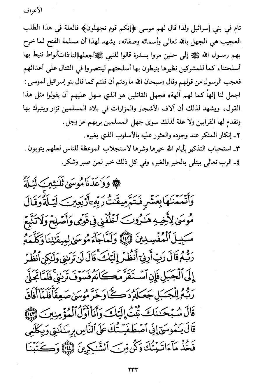 وَوَاعَدْنَا مُوسَى ثَلاَثِينَ لَيْلَةً وَأَتْمَمْنَاهَا بِعَشْرٍ فَتَمَّ مِيقَاتُ رَبِّهِ أَرْبَعِينَ لَيْلَةً وَقَالَ مُوسَى لأَخِيهِ هَارُونَ اخْلُفْنِي فِي قَوْمِي وَأَصْلِحْ وَلاَ تَتَّبِعْ سَبِيلَ الْمُفْسِدِينَ (142) وَلَمَّا جَاء مُوسَى لِمِيقَاتِنَا وَكَلَّمَهُ رَبُّهُ قَالَ رَبِّ أَرِنِي أَنظُرْ إِلَيْكَ قَالَ لَن تَرَانِي وَلَكِنِ انظُرْ إِلَى الْجَبَلِ فَإِنِ اسْتَقَرَّ مَكَانَهُ فَسَوْفَ تَرَانِي فَلَمَّا تَجَلَّى رَبُّهُ لِلْجَبَلِ جَعَلَهُ دَكًّا وَخَرَّ موسَى صَعِقًا فَلَمَّا أَفَاقَ قَالَ سُبْحَانَكَ تُبْتُ إِلَيْكَ وَأَنَاْ أَوَّلُ الْمُؤْمِنِينَ (143) قَالَ يَا مُوسَى إِنِّي اصْطَفَيْتُكَ عَلَى النَّاسِ بِرِسَالاَتِي وَبِكَلاَمِي فَخُذْ مَا آتَيْتُكَ وَكُن مِّنَ الشَّاكِرِينَ (144) وَكَتَبْنَا