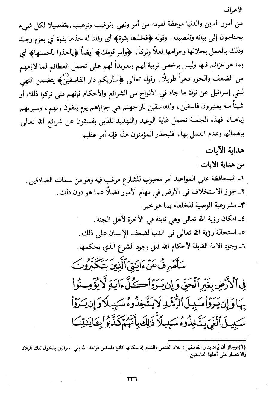 1 وجائز أن يُراد بدار الفاسقين: بلاد القدس والشام إذ سكانها كانوا فاسقين فواعد الله بني إسرائيل بدخول تلك البلاد والانتصار على أهلها الفاسقين.