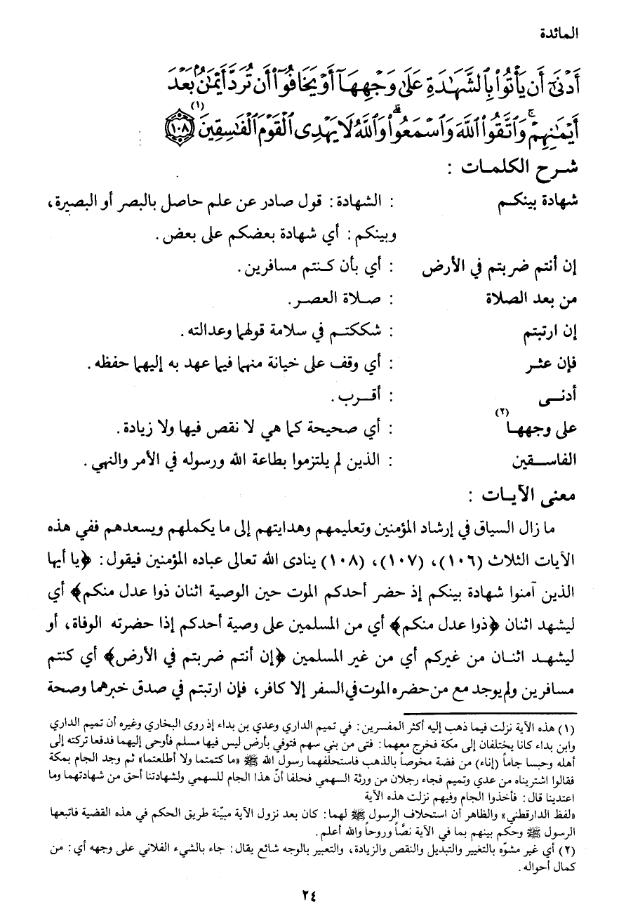 ما زال السياق في إرشاد المؤمنين وتعليمهم وهدايتهم إلى ما يكملهم ويسعدهم ففي هذه الآيات الثلاث (106) ، (107) ، (108) ينادي الله تعالى عباده المؤمنين فيقول: {يا أيها الذين آمنوا شهادة بينكم إذ حضر أحدكم الموت حين الوصية اثنان ذوا عدل منكم} أي ليشهد اثنان {ذوا عدل منكم} أي من المسلمين على وصية أحدكم إذا حضرته الوفاة، أو ليشهد اثنان من غيركم أي من غير المسلمين {إن أنتم ضربتم في الأرض} أي كنتم مسافرين ولم يوجد مع من حضره الموت في السفر إلا كافر، فإن ارتبتم في صدق خبرهما وصحة