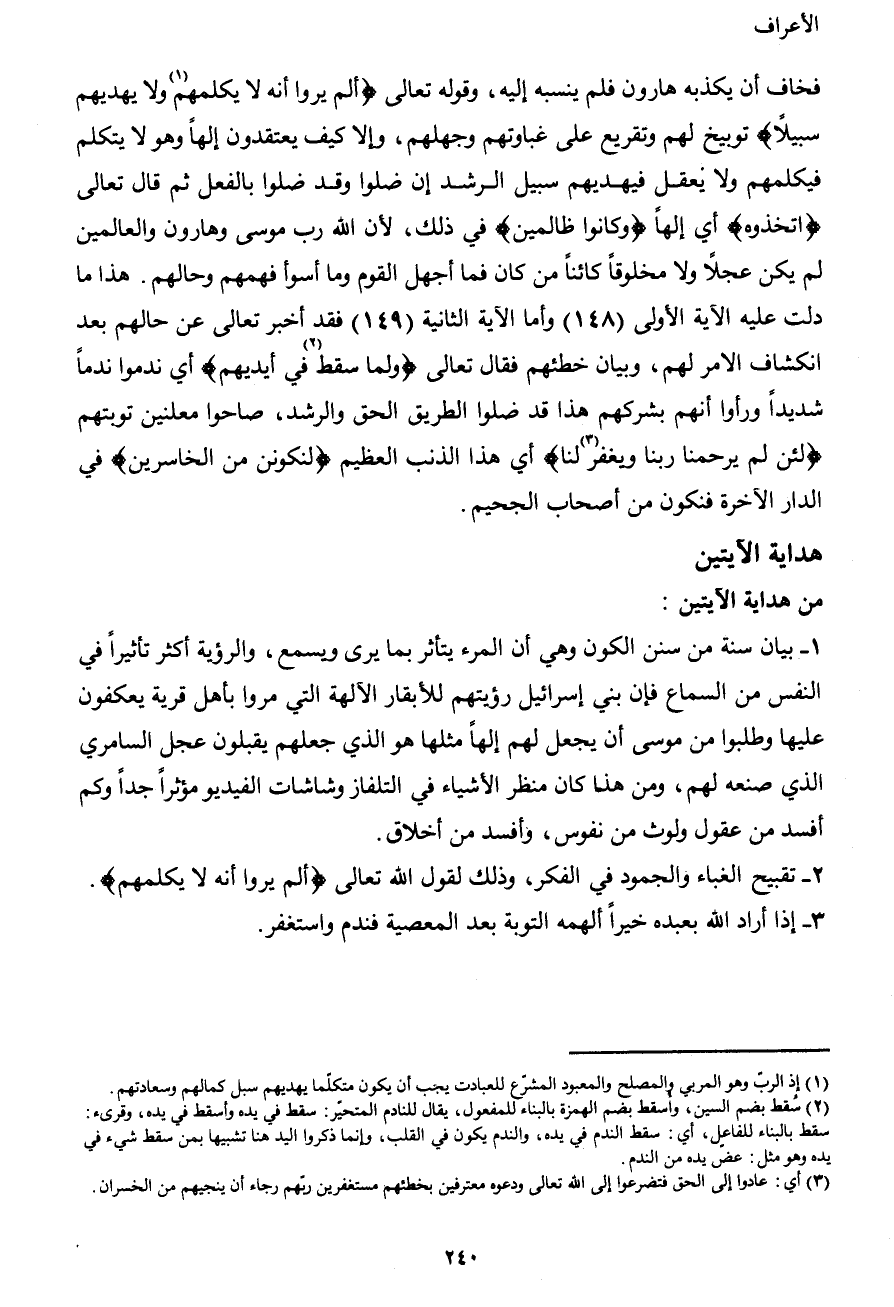 فخاف أن يكذبه هارون فلم ينسبه إليه، وقوله تعالى {ألم يروا أنه لا يكلمهم1 ولا يهديهم سبيلاً} توبيخ لهم وتقريع على غباوتهم وجهلهم، وإلا كيف يعتقدون إلهاً وهو لا يتكلم فيكلمهم ولا يُعقل فيهديهم سبيل الرشد إن ضلوا وقد ضلوا بالفعل ثم قال تعالى {اتخذوه} أي إلهاً {وكانوا ظالمين} في ذلك، لأن الله رب موسى وهارون والعالمين لم يكن عجلاً ولا مخلوقاً كائناً من كان فما أجهل القوم وما أسوأ فهمهم وحالهم. هذا ما دلت عليه الآية الأولى (148) وأما الآية الثانية (149) فقد أخبر تعالى عن حالهم بعد انكشاف الأمر لهم، وبيان خطئهم فقال تعالى {ولما سقط2 في أيديهم} أي ندموا ندماً شديداً ورأوا أنهم بشركهم هذا قد ضلوا الطريق الحق والرشد، صاحوا معلنين توبتهم {لئن لم يرحمنا ربنا ويغفر3 لنا} أي هذا الذنب العظيم {لنكونن من الخاسرين} في الدار الآخرة فنكون من أصحاب الجحيم.