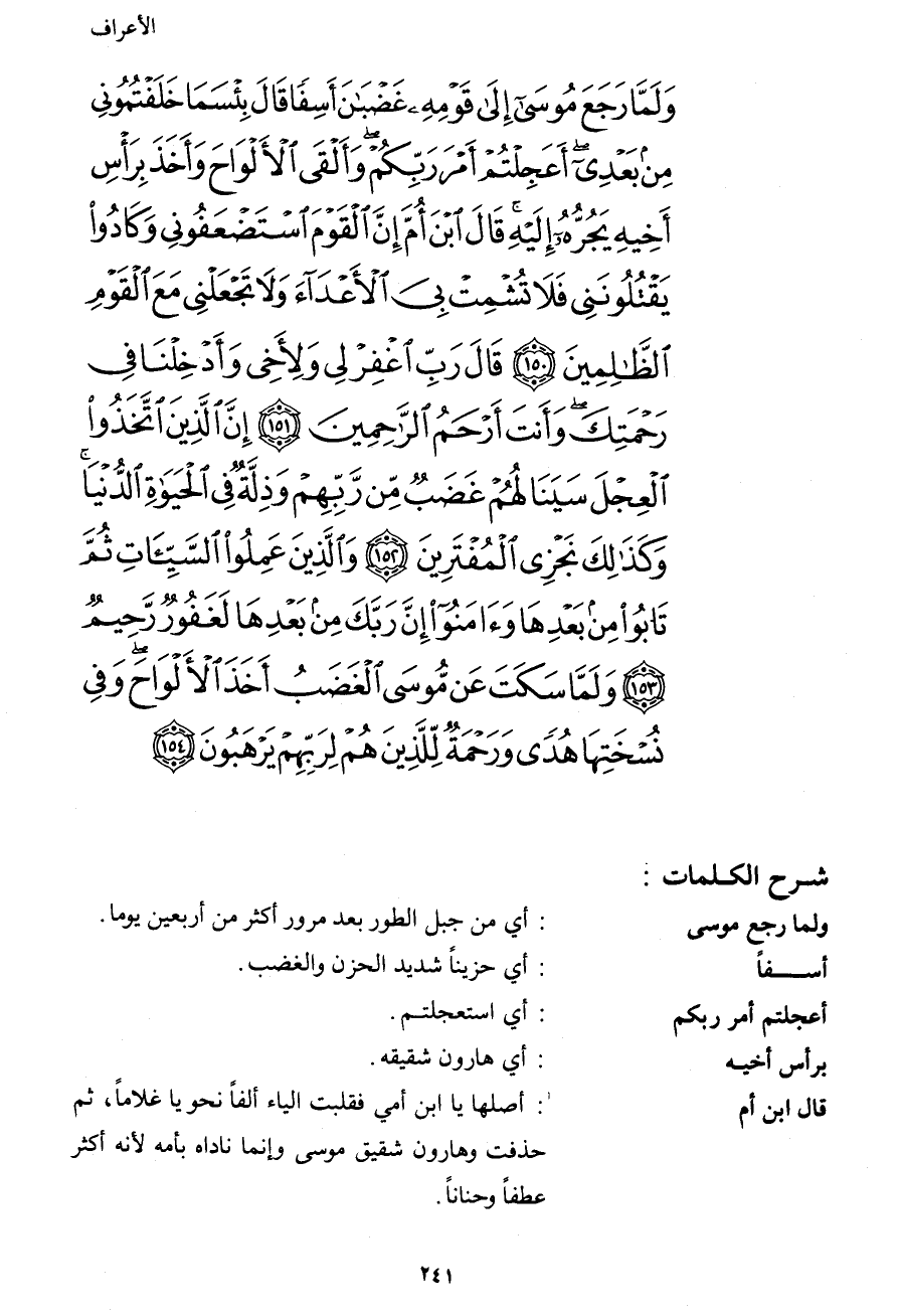 وَلَمَّا رَجَعَ مُوسَى إِلَى قَوْمِهِ غَضْبَانَ أَسِفًا قَالَ بِئْسَمَا خَلَفْتُمُونِي مِن بَعْدِيَ أَعَجِلْتُمْ أَمْرَ رَبِّكُمْ وَأَلْقَى الألْوَاحَ وَأَخَذَ بِرَأْسِ أَخِيهِ يَجُرُّهُ إِلَيْهِ قَالَ ابْنَ أُمَّ إِنَّ الْقَوْمَ اسْتَضْعَفُونِي وَكَادُواْ يَقْتُلُونَنِي فَلاَ تُشْمِتْ بِيَ الأعْدَاء وَلاَ تَجْعَلْنِي مَعَ الْقَوْمِ الظَّالِمِينَ (150) قَالَ رَبِّ اغْفِرْ لِي وَلأَخِي وَأَدْخِلْنَا فِي رَحْمَتِكَ وَأَنتَ أَرْحَمُ الرَّاحِمِينَ (151) إِنَّ الَّذِينَ اتَّخَذُواْ الْعِجْلَ سَيَنَالُهُمْ غَضَبٌ مِّن رَّبِّهِمْ وَذِلَّةٌ فِي الْحَياةِ الدُّنْيَا وَكَذَلِكَ نَجْزِي الْمُفْتَرِينَ (152) وَالَّذِينَ عَمِلُواْ السَّيِّئَاتِ ثُمَّ تَابُواْ مِن بَعْدِهَا وَآمَنُواْ إِنَّ رَبَّكَ مِن بَعْدِهَا لَغَفُورٌ رَّحِيمٌ (153) وَلَمَّا سَكَتَ عَن مُّوسَى الْغَضَبُ أَخَذَ الأَلْوَاحَ وَفِي نُسْخَتِهَا هُدًى وَرَحْمَةٌ لِّلَّذِينَ هُمْ لِرَبِّهِمْ يَرْهَبُونَ (154)