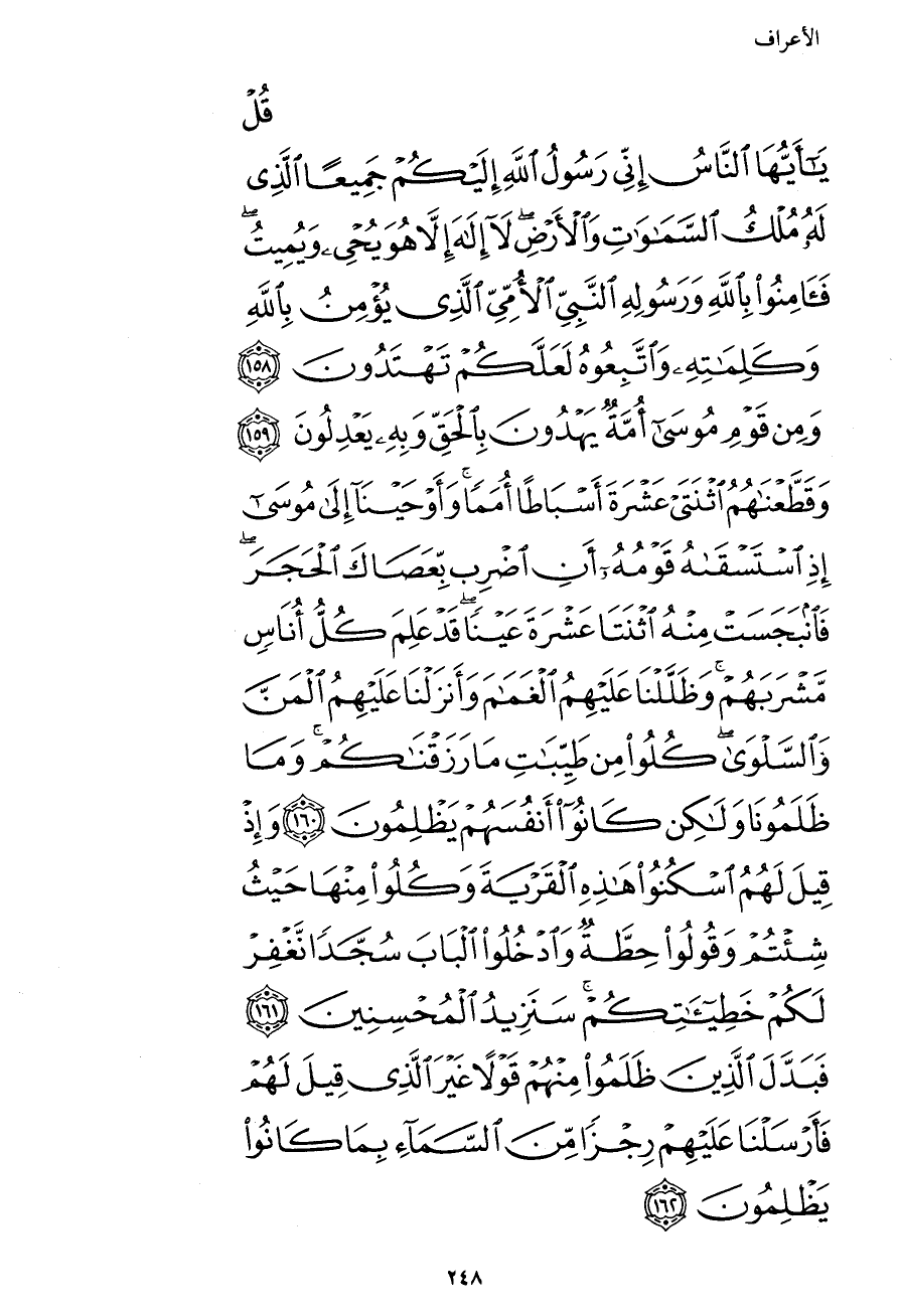 قُلْ يَا أَيُّهَا النَّاسُ إِنِّي رَسُولُ اللهِ إِلَيْكُمْ جَمِيعًا الَّذِي لَهُ مُلْكُ السَّمَاوَاتِ وَالأَرْضِ لا إِلَهَ إِلاَّ هُوَ يُحْيِي وَيُمِيتُ فَآمِنُواْ بِاللهِ وَرَسُولِهِ النَّبِيِّ الأُمِّيِّ الَّذِي يُؤْمِنُ بِاللهِ وَكَلِمَاتِهِ وَاتَّبِعُوهُ لَعَلَّكُمْ تَهْتَدُونَ (158) وَمِن قَوْمِ مُوسَى أُمَّةٌ يَهْدُونَ بِالْحَقِّ وَبِهِ يَعْدِلُونَ (159) وَقَطَّعْنَاهُمُ اثْنَتَيْ عَشْرَةَ أَسْبَاطًا أُمَمًا وَأَوْحَيْنَا إِلَى مُوسَى إِذِ اسْتَسْقَاهُ قَوْمُهُ أَنِ اضْرِب بِّعَصَاكَ الْحَجَرَ فَانبَجَسَتْ مِنْهُ اثْنَتَا عَشْرَةَ عَيْنًا قَدْ عَلِمَ كُلُّ أُنَاسٍ مَّشْرَبَهُمْ وَظَلَّلْنَا عَلَيْهِمُ الْغَمَامَ وَأَنزَلْنَا عَلَيْهِمُ الْمَنَّ وَالسَّلْوَى كُلُواْ مِن طَيِّبَاتِ مَا رَزَقْنَاكُمْ وَمَا ظَلَمُونَا وَلَكِن كَانُواْ أَنفُسَهُمْ يَظْلِمُونَ (160) وَإِذْ قِيلَ لَهُمُ اسْكُنُواْ هَذِهِ الْقَرْيَةَ وَكُلُواْ مِنْهَا حَيْثُ شِئْتُمْ وَقُولُواْ حِطَّةٌ وَادْخُلُواْ الْبَابَ سُجَّدًا نَّغْفِرْ لَكُمْ خَطِيئَاتِكُمْ سَنَزِيدُ الْمُحْسِنِينَ (161) فَبَدَّلَ الَّذِينَ ظَلَمُواْ مِنْهُمْ قَوْلاً غَيْرَ الَّذِي قِيلَ لَهُمْ فَأَرْسَلْنَا عَلَيْهِمْ رِجْزًا مِّنَ السَّمَاء بِمَا كَانُواْ يَظْلِمُونَ (162)
