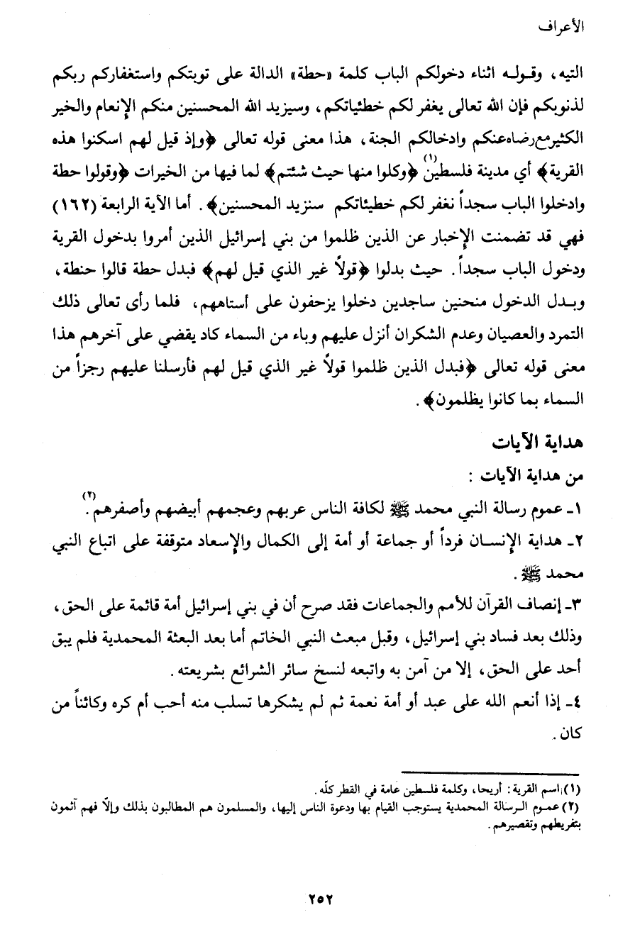 التيه، وقوله إثناء دخولكم الباب كلمة {حطة} الدالة على توبتكم واستغفاركم ربكم لذنوبكم فإن الله تعالى يغفر لكم خطئياتكم، وسيزيد الله المحسنين منكم الإنعام والخير الكثير مع رضاه عنكم وإدخالكم الجنة، هذا معنى قوله تعالى {وإذ قيل لهم اسكنوا هذه القرية} أي مدينة فلسطين1 {وكلوا منها حيث شئتم} لما فيها من الخيرات {وقولوا حطة وادخلوا الباب سجداً نغفر لكم خطيئاتكم سنزيد المحسنين} . أما الآية الرابعة (162) فهي قد تضمنت الإخبار عن الذين ظلموا من بني إسرائيل الذين أمروا بدخول القرية ودخول الباب سجداً. حيث بدلوا {قولاً غير الذي قيل لهم} فبدل حطة قالوا حنطة، وبدل الدخول منحنين ساجدين دخلوا يزحفون على أستاههم، فلما رأى تعالى ذلك التمرد والعصيان وعدم الشكران أنزل عليهم وباء من السماء كاد يقضي على آخرهم هذا معنى قوله تعالى {فبدل الذين ظلموا منهم قولاً غير الذي قيل لهم فأرسلنا عليهم رجزاً من السماء بما كانوا يظلمون} .