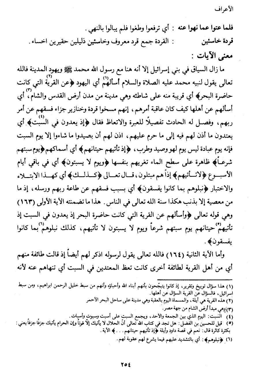 ما زال السياق في بني إسرائيل إلا أنه هنا مع رسول الله محمد صَلَّى اللهُ عَلَيْهِ وَسَلَّمَ ويهود المدينة فالله تعالى يقول لنبيه محمد عليه الصلاة والسلام أسألهم1 أي اليهود {عن القرية2 التي كانت حاضرة البحر} أي قريبة منه على شاطئه وهي مدينة من مدن أرض القدس والشام3، أي أسألهم عن أهلها كيف كان عاقبة أمرهم، أنهم مسخوا قردة وخنازير جزاء فسقهم عن أمر ربهم، وفصل له الحادث تفصيلاً للعبرة والاتعاظ فقال {إذ يعدون في السبت4} أي يعتدون ما أذن لهم فيه إلى ما حرم عليهم، أذن لهم أن يصيدوا ما شاءوا إلا يوم السبت فإنه يوم عبادة ليس يوم لهو وصيد وطرب، {إذ تأتيهم حيتانهم} أي أسماكهم {يوم سبتهم شرعاً} ظاهرة على سطح الماء تغريهم بنفسها {ويوم لا يسبتون} أي في باقي أيام الأسبوع {لا تأتيهم} إذاً هم مبتلون، قال تعالى {كذلك} أي كهذا الابتلاء والاختبار {نبلوهم بما كانوا يفسقون} أي بسبب فسقهم عن طاعة ربهم ورسله، إذ ما من معصية إلا بذنب هكذا سنة الله تعالى في الناس. هذا ما تضمنته الآية الأولى (163) وهي قوله تعالى {وأسألهم عن القرية التي كانت حاضرة البحر إذ يعدون في السبت إذ تأتيهم5 حيتانهم يوم سبتهم شرعاً ويوم لا يسبتون لا تأتيهم، كذلك نبلوهم6 بما كانوا يفسقون} .