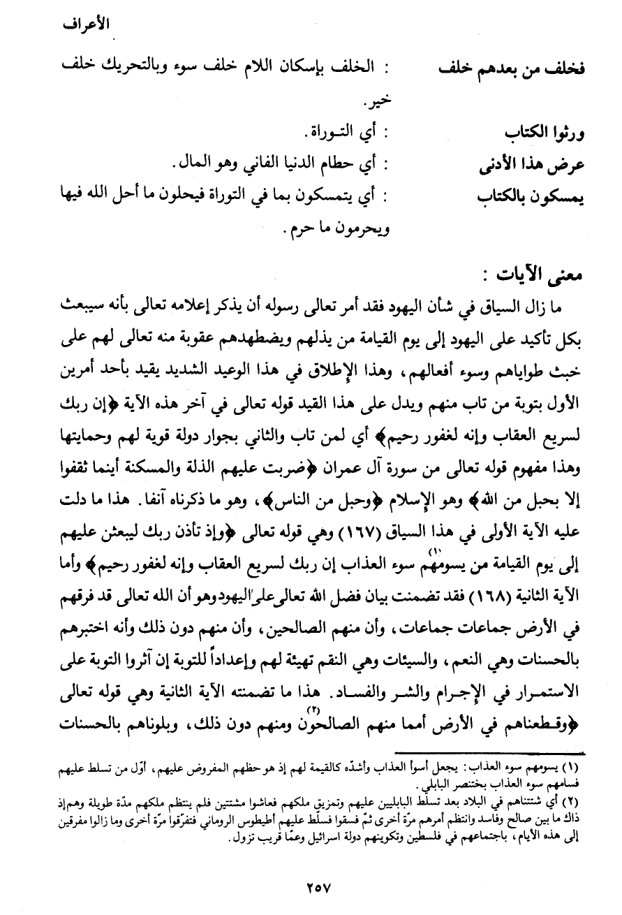 ما زال السياق في شأن اليهود فقد أمر تعالى رسوله أن يذكر إعلامه تعالى بأنه سيبعث بكل تأكيد على اليهود إلى يوم القيامة من يذلهم ويضطهدهم عقوبة منه تعالى لهم على خبث طواياهم وسوء أفعالهم، وهذا الإطلاق في هذا الوعيد الشديد يقيد بأحد أمرين الأول بتوبة من تاب منهم ويدل على هذا القيد قوله تعالى في آخر هذه الآية {إن ربك لسريع العقاب وإنه لغفور رحيم} أي لمن تاب والثاني بجوار دولة قوية لهم وحمايتها وهذا مفهوم قوله تعالى من سورة آل عمران {ضربت عليهم الذلة والمسكنة أينما ثقفوا إلا بحبل من الله} وهو الإسلام {وحبل من الناس} ، وهو ما ذكرناه آنفاً. هذا ما دلت عليه الآية الأولى في هذا السياق (167) وهي قوله تعالى {وإذ تأذن ربك ليبعثن عليهم إلى يوم القيامة من يسومهم1 سوء العذاب إن ربك لسريع العقاب وإنه لغفور رحيم} وأما الآية الثانية (168) فقد تضمنت بيان فضل الله تعالى على اليهود وهو أن الله تعالى قد فرقهم في الأرض جماعات جماعات، وأن منهم الصالحين، وأن منهم دون ذلك وأنه اختبرهم بالحسنات وهي النعم، والسيئات وهي النقم تهيئة لهم وإعداداً للتوبة إن آثروا التوبة على الاستمرار في الإجرام والشر والفساد. هذا ما تضمنته الآية الثانية وهي قوله تعالى {وقطعناهم في الأرض أمما منهم الصالحون2 ومن دون ذلك، وبلوناهم بالحسنات