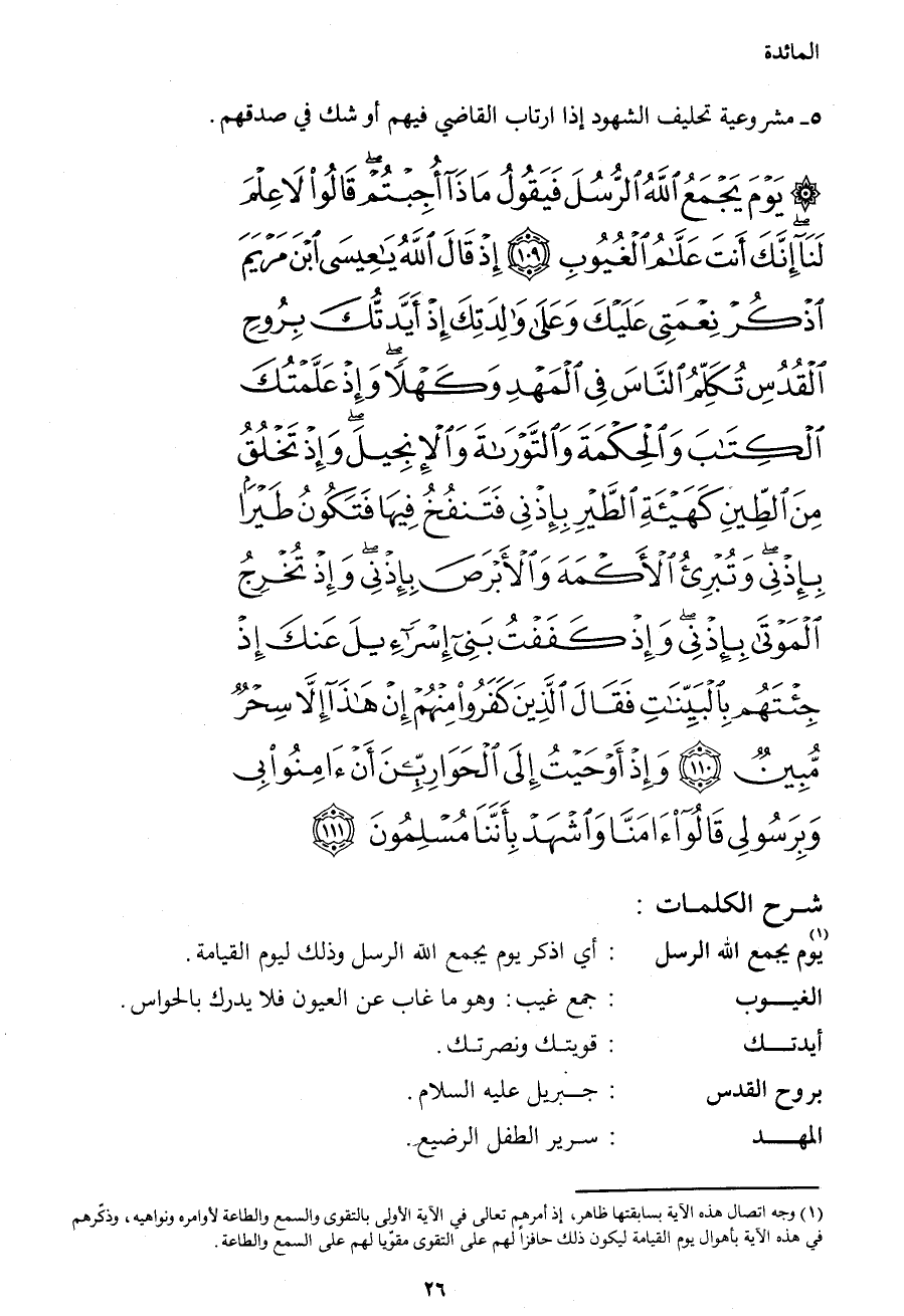يَوْمَ يَجْمَعُ اللهُ الرُّسُلَ فَيَقُولُ مَاذَا أُجِبْتُمْ قَالُواْ لاَ عِلْمَ لَنَا إِنَّكَ أَنتَ عَلاَّمُ الْغُيُوبِ (109) إِذْ قَالَ اللهُ يَا عِيسى ابْنَ مَرْيَمَ اذْكُرْ نِعْمَتِي عَلَيْكَ وَعَلَى وَالِدَتِكَ إِذْ أَيَّدتُّكَ بِرُوحِ الْقُدُسِ تُكَلِّمُ النَّاسَ فِي الْمَهْدِ وَكَهْلاً وَإِذْ عَلَّمْتُكَ الْكِتَابَ وَالْحِكْمَةَ وَالتَّوْرَاةَ وَالإِنجِيلَ وَإِذْ تَخْلُقُ مِنَ الطِّينِ كَهَيْئَةِ الطَّيْرِ بِإِذْنِي فَتَنفُخُ فِيهَا فَتَكُونُ طَيْرًا بِإِذْنِي وَتُبْرِىءُ الأَكْمَهَ وَالأَبْرَصَ بِإِذْنِي وَإِذْ تُخْرِجُ الْمَوتَى بِإِذْنِي وَإِذْ كَفَفْتُ بَنِي إِسْرَائِيلَ عَنكَ إِذْ جِئْتَهُمْ بِالْبَيِّنَاتِ فَقَالَ الَّذِينَ كَفَرُواْ مِنْهُمْ إِنْ هَذَا إِلاَّ سِحْرٌ مُّبِينٌ (110) وَإِذْ أَوْحَيْتُ إِلَى الْحَوَارِيِّينَ أَنْ آمِنُواْ بِي وَبِرَسُولِي قَالُوَاْ آمَنَّا وَاشْهَدْ بِأَنَّنَا مُسْلِمُونَ (111)