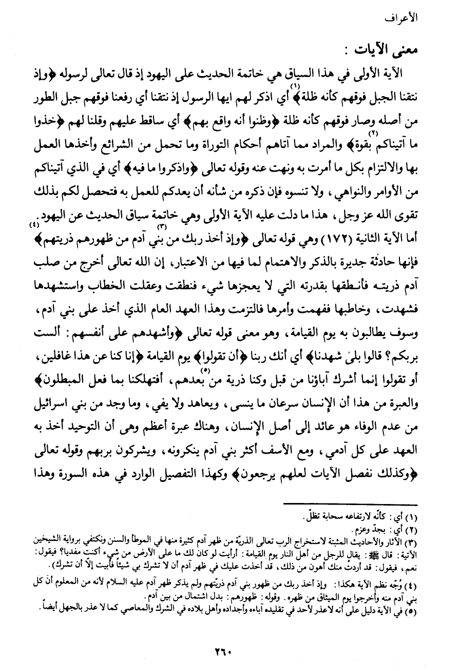 أما الآية الثانية (172) وهي قوله تعالى {وإذ أخذ ربك من بني3 آدم من ظهورهم ذريتهم} 4 فإنها حادثة جديرة بالذكر والاهتمام لما فيها من الاعتبار، إن الله تعالى أخرج من صلب آدم ذريته فأنطقها بقدرته التي لا يعجزها شيء فنطقت وعقلت الخطاب واستشهدها فشهدت، وخاطبها ففهمت وأمرها فالتزمت وهذا العهد العام الذي أخذ على بني آدم، وسوف يطالبون به يوم القيامة، وهو معنى قوله تعالى {وأشهدهم على أنفسهم: ألست بربكم؟ قالوا بلى شهدنا} أي أنك ربنا {أن تقولوا} يوم القيامة {إنا كنا عن هذا غافلين، أو تقولوا إنما أشرك آباؤنا من قبل وكنا ذرية من بعدهم5، أفتهلكنا بما فعل المبطلون} والعبرة من هذا أن الإنسان سرعان ما ينسى، ويعاهد ولا يفي، وما وجد من بني إسرائيل من عدم الوفاء هو عائد إلى أصل الإنسان، وهناك عبرة أعظم وهى أن التوحيد أخذ به العهد على كل آدمي، ومع الأسف أكثر بني آدم ينكرونه، ويشركون بربهم وقوله تعالى {وكذلك نفصل الآيات لعلهم يرجعون} وكهذا التفصيل الوارد في هذه السورة وهذا
