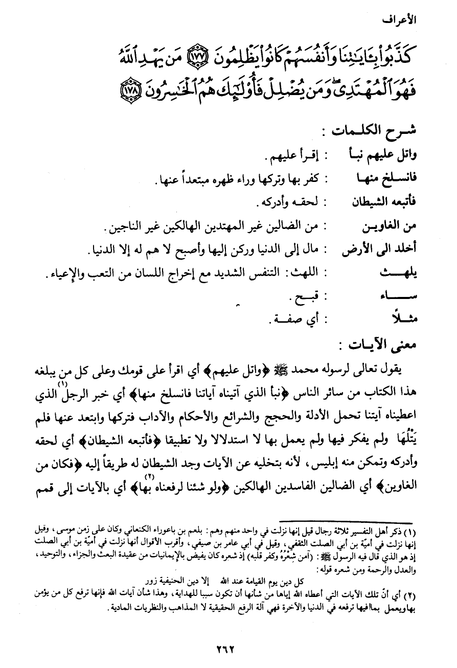 يقول تعالى لرسوله محمد صَلَّى اللهُ عَلَيْهِ وَسَلَّمَ {واتل عليهم} أي اقرأ على قومك وعلى كل من يبلغه هذا الكتاب من سائر الناس {نبأ الذي آتيناه آياتنا فانسلخ منها} أي خبر الرجل1 الذي أعطيناه آيتنا تحمل الأدلة والحجج والشرائع والأحكام والآداب فتركها وابتعد عنها فلم يَتْلُهَا ولم يفكر فيها ولم يعمل بها لا استدلالا ولا تطبيقا {فأتبعه الشيطان} أي لحقه وأدركه وتمكن منه إبليس، لأنه بتخليه عن الآيات وجد الشيطان له طريقاً إليه {فكان من الغاوين} أي الضالين الفاسدين الهالكين {ولو شئنا لرفعناه بها2} أي بالآيات إلى قمم