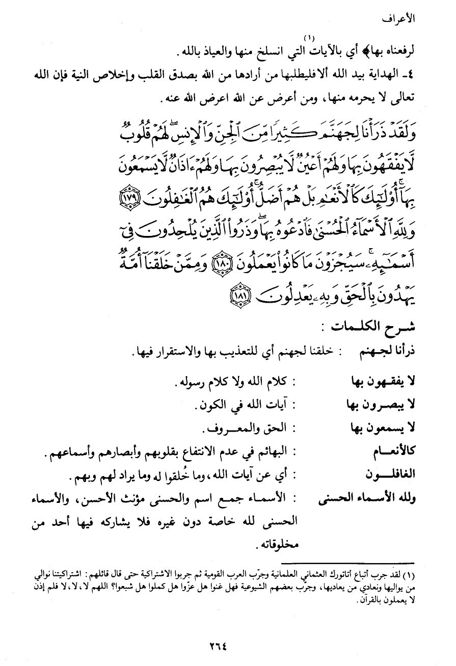 وَلَقَدْ ذَرَأْنَا لِجَهَنَّمَ كَثِيرًا مِّنَ الْجِنِّ وَالإِنسِ لَهُمْ قُلُوبٌ لاَّ يَفْقَهُونَ بِهَا وَلَهُمْ أَعْيُنٌ لاَّ يُبْصِرُونَ بِهَا وَلَهُمْ آذَانٌ لاَّ يَسْمَعُونَ بِهَا أُوْلَئِكَ كَالأَنْعَامِ بَلْ هُمْ أَضَلُّ أُوْلَئِكَ هُمُ الْغَافِلُونَ (179) وَلِلّهِ الأَسْمَاء الْحُسْنَى فَادْعُوهُ بِهَا وَذَرُواْ الَّذِينَ يُلْحِدُونَ فِي أَسْمَآئِهِ سَيُجْزَوْنَ مَا كَانُواْ يَعْمَلُونَ (180) وَمِمَّنْ خَلَقْنَا أُمَّةٌ يَهْدُونَ بِالْحَقِّ وَبِهِ يَعْدِلُونَ (181)