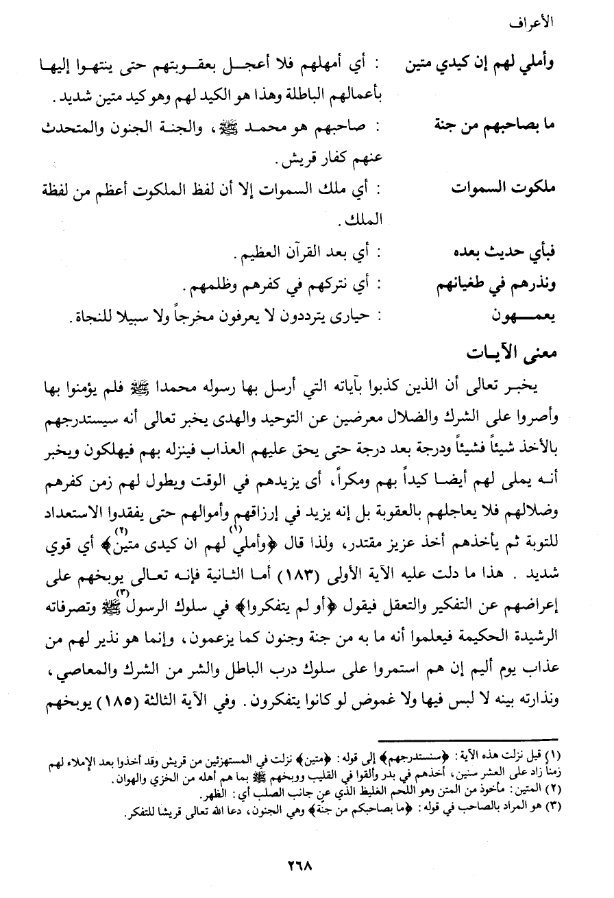 يخبر تعالى أن الذين كذبوا بآياته التي أرسل بها رسوله محمدا صَلَّى اللهُ عَلَيْهِ وَسَلَّمَ فلم يؤمنوا بها وأصروا على الشرك والضلال معرضين عن التوحيد والهدى يخبر تعالى أنه سيستدرجهم بالأخذ شيئاً فشيئاً ودرجة بعد درجة حتى يحق عليهم العذاب فينزله بهم فيهلكون ويخبر أنه يملى لهم أيضاً كيداً بهم ومكراً، أي يزيدهم في الوقت ويطول لهم زمن كفرهم وضلالهم فلا يعاجلهم بالعقوبة بل إنه يزيد في إرزاقهم وأموالهم حتى يفقدوا الاستعداد للتوبة ثم يأخذهم أخذ عزيز مقتدر، ولذا قال {وأملي1 لهم إن كيدي متين2} أي قوي شديد. هذا ما دلت عليه الآية الأولى (183) أما الثانية فإنه تعالى يوبخهم على إعراضهم عن التفكير والتعقل فيقول {أو لم يتفكروا} في سلوك الرسول3 صَلَّى اللهُ عَلَيْهِ وَسَلَّمَ وتصرفاته الرشيدة الحكيمة فيعلموا أنه ما به من جنة وجنون كما يزعمون، وإنما هو نذير لهم من عذاب يوم أليم إن هم استمروا على سلوك درب الباطل والشر من الشرك والمعاصي، ونذارته بينه لا لبس فيها ولا غموض لو كانوا يتفكرون. وفي الآية الثالثة (185) يوبخهم