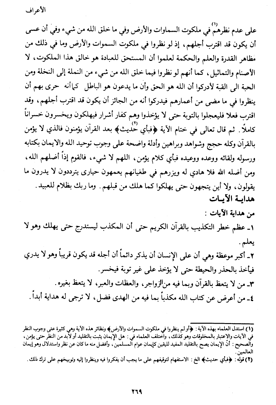 على عدم نظرهم1 في ملكوت السموات والأرض وفي ما خلق الله من شيء وفي أن عسى أن يكون قد اقترب أجلهم، إذ لو نظروا في ملكوت السموات والأرض وما في ذلك من مظاهر القدرة والعلم والحكمة لعلموا أن المستحق للعبادة هو خالق هذا الملكوت، لا الأصنام والتماثيل، كما أنهم لو نظروا فيما خلق الله من شيء من النملة إلى النخلة ومن الحبة إلى القبة لأدركوا أن الله هو الحق وأن ما يدعون هو الباطل كما أنه حرى بهم أن ينظروا في ما مضى من أعمارهم فيدركوا أنه من الجائز أن يكون قد اقترب أجلهم، وقد اقترب فعلا فليعجلوا بالتوبة حتى لا يؤخذوا وهم كفار أشرار فيهلكون ويخسرون خسرانا ًكاملاً. ثم قال تعالى في ختام الآية {فبأي حديث2} بعد القرآن يؤمنون فالذي لا يؤمن بالقرآن وكله حجج وشواهد وبراهين وأدلة واضحة على وجوب توحيد الله والإيمان بكتابه ورسوله ولقائه ووعده ووعيده فبأي كلام يؤمن، اللهم لا شيء، فالقوم إذاً أضلهم الله، ومن أضله الله فلا هادي له ويذرهم في طغيانهم يعمهون حيارى يترددون لا يدرون ما يقولون، ولا أين يتجهون حتى يهلكوا كما هلك من قبلهم. وما ربك بظلام للعبيد.